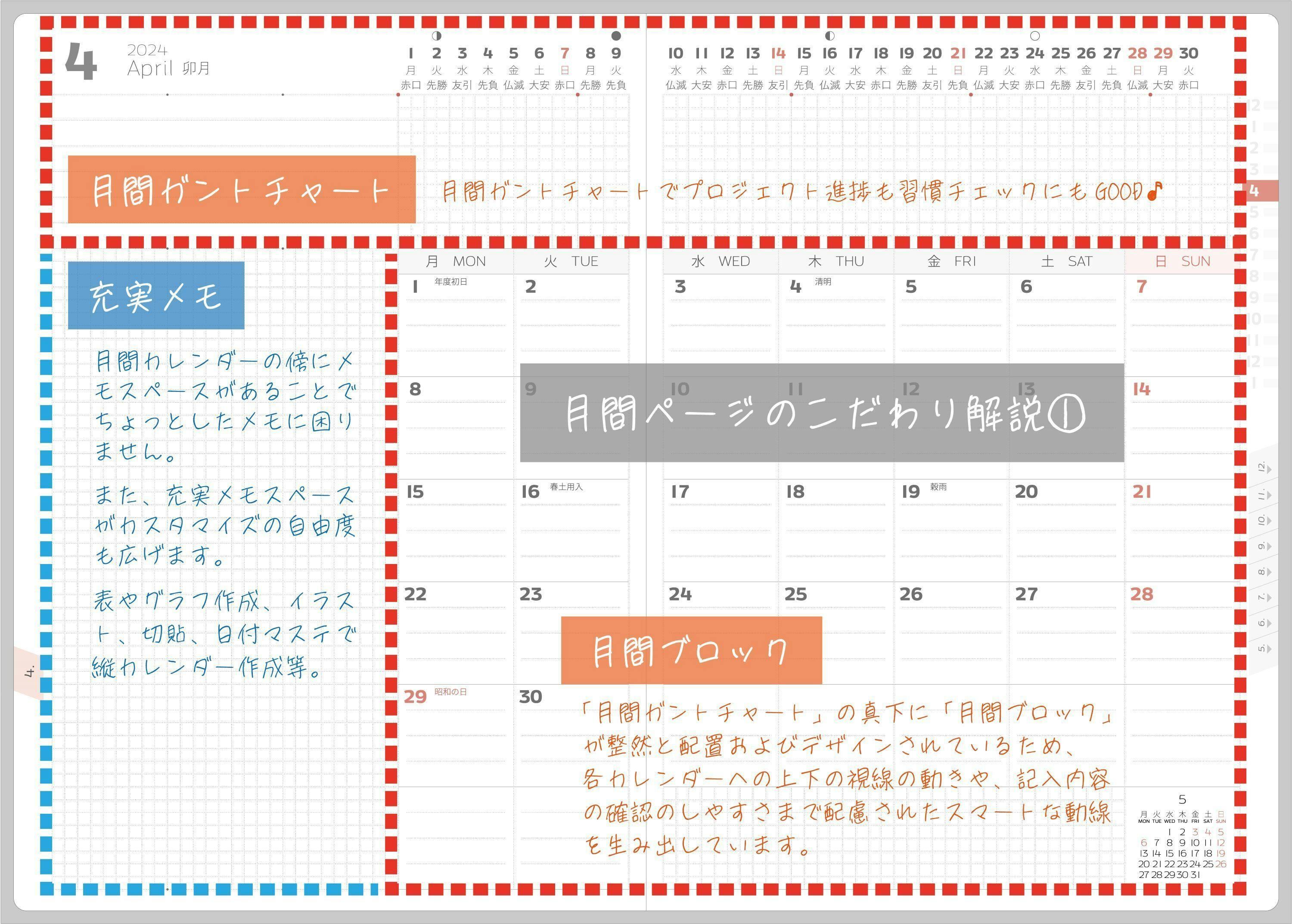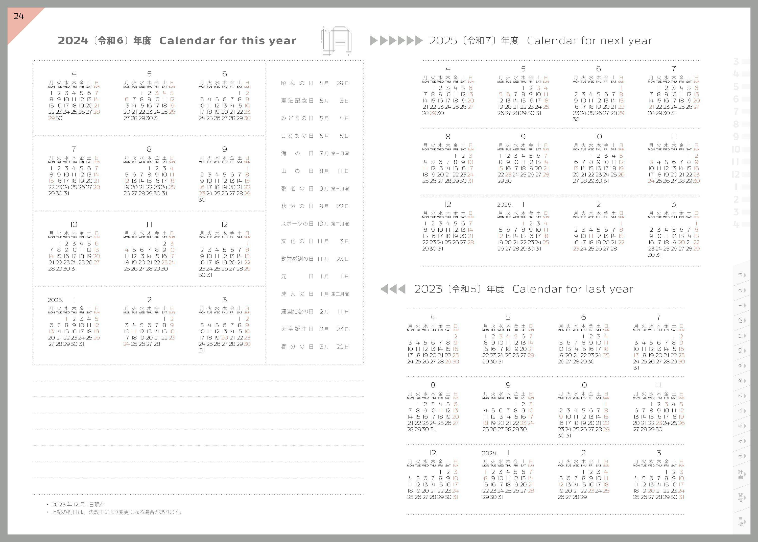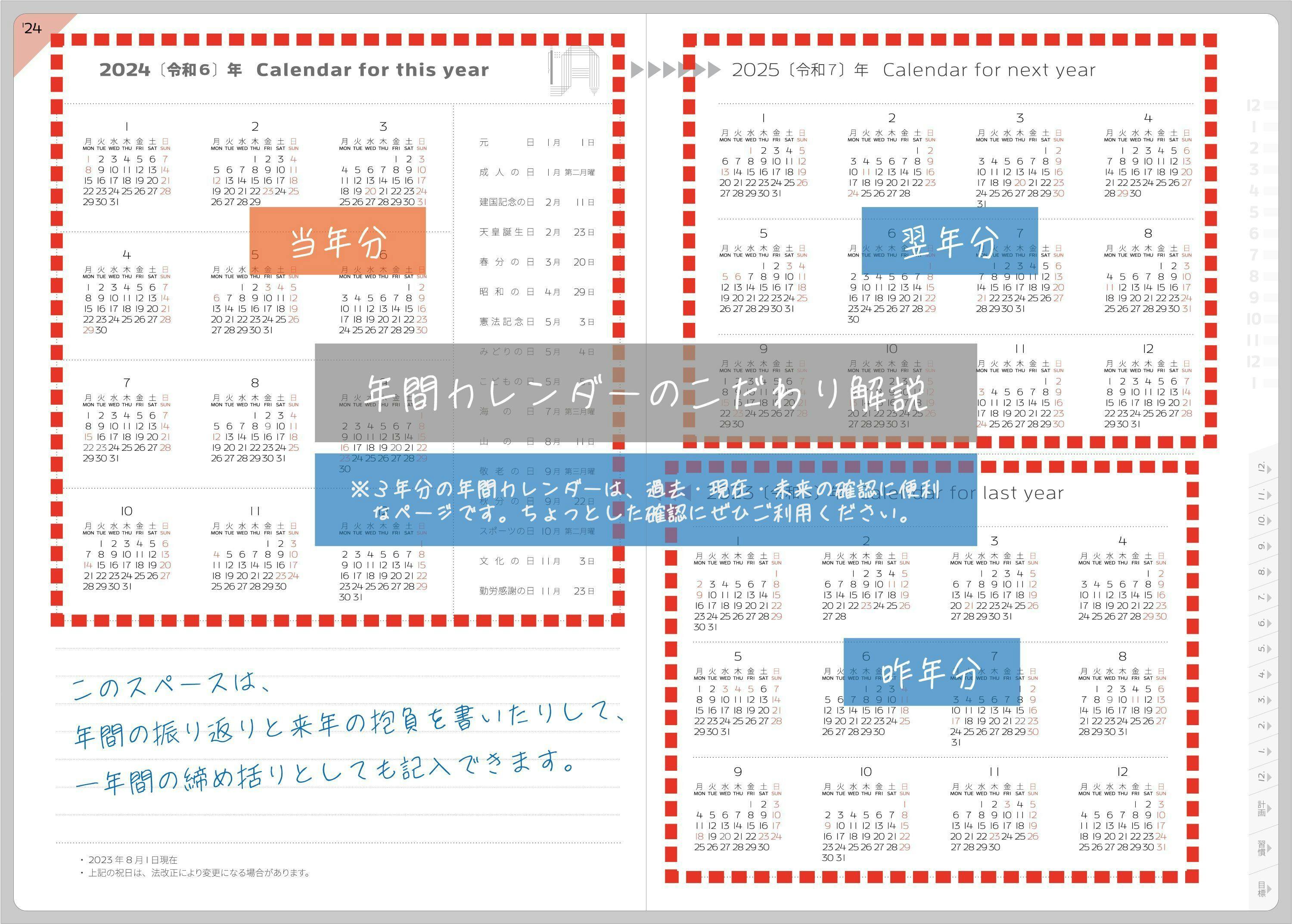 A:「2024年1月始まり手帳」または「卓上カレンダー」も商品化しており、1月始まり手帳は3シリーズをご用意しております。ただし、1月始まり手帳は「公式通販サイト」からのご購入の形となります。予めご了承ください。(※こちらで確認できます → 公式通販サイト)