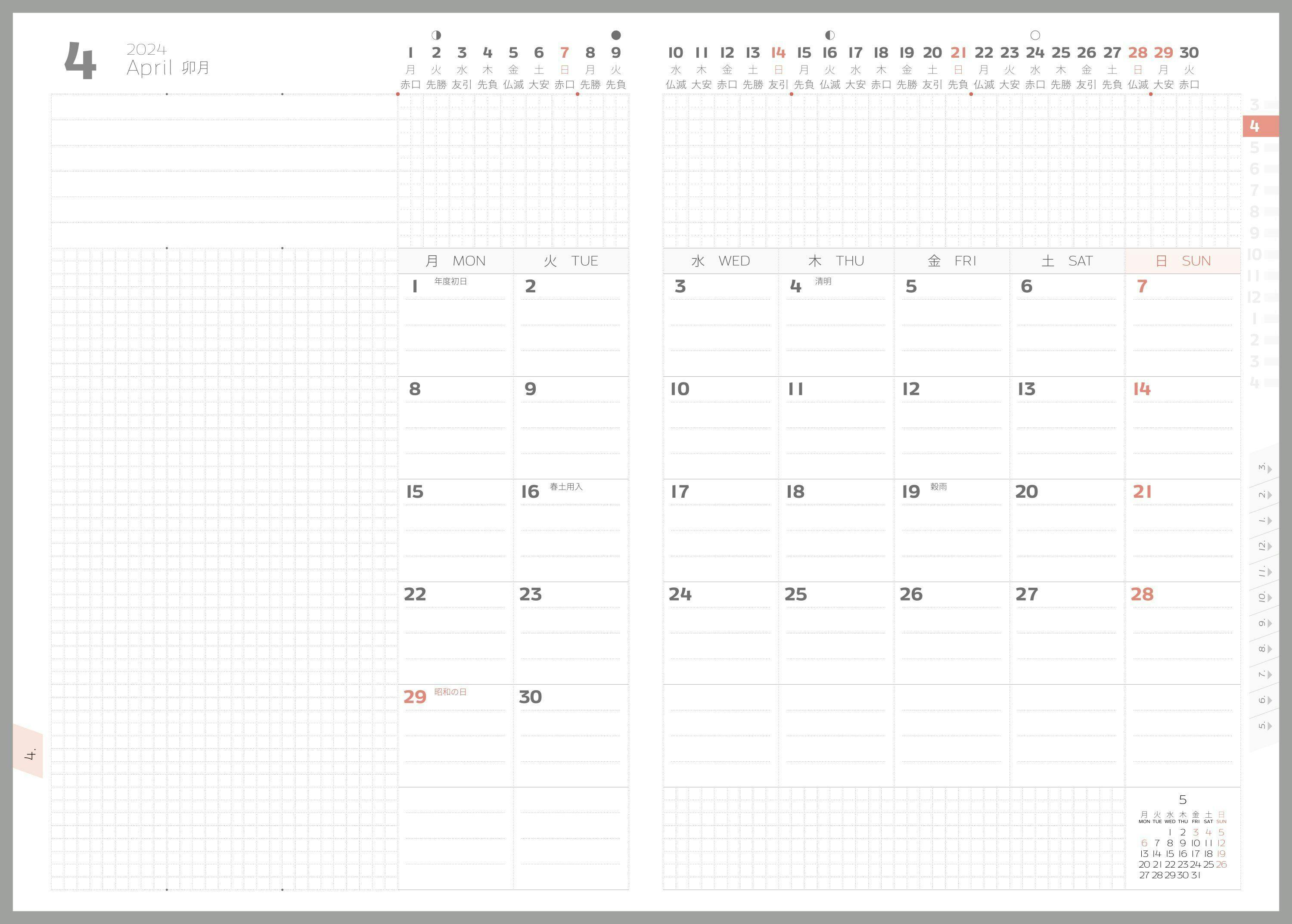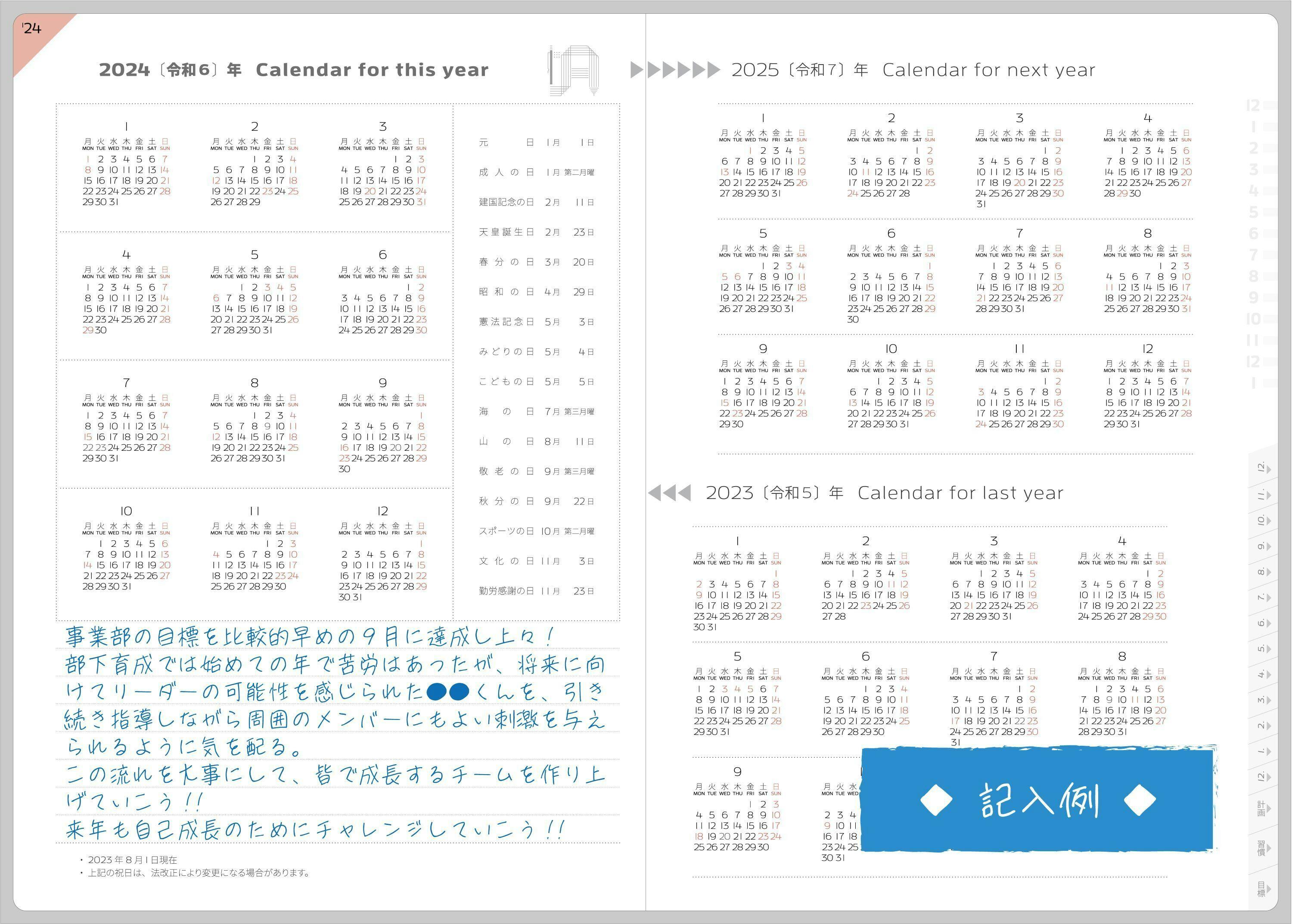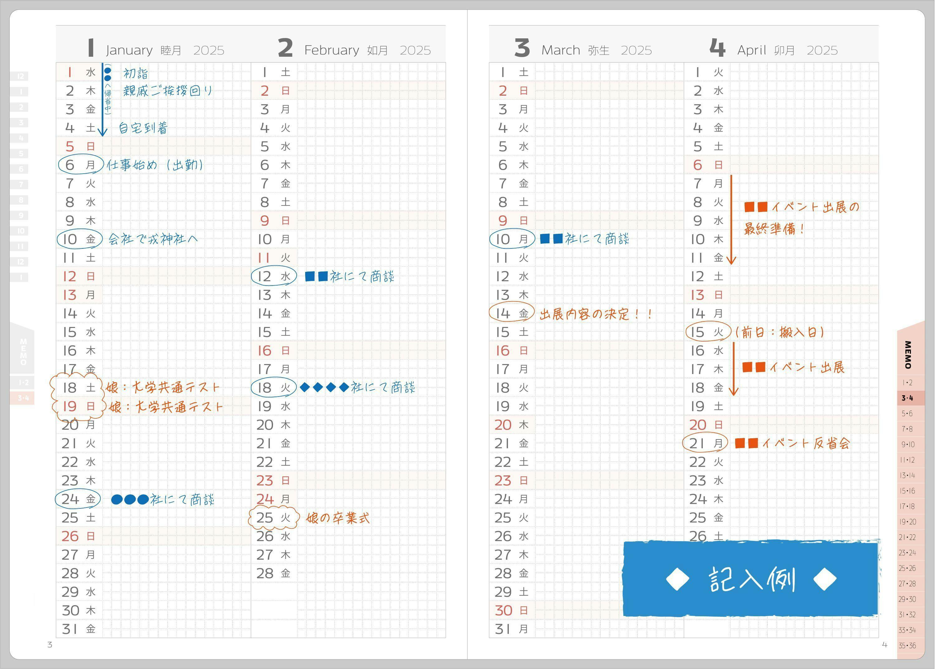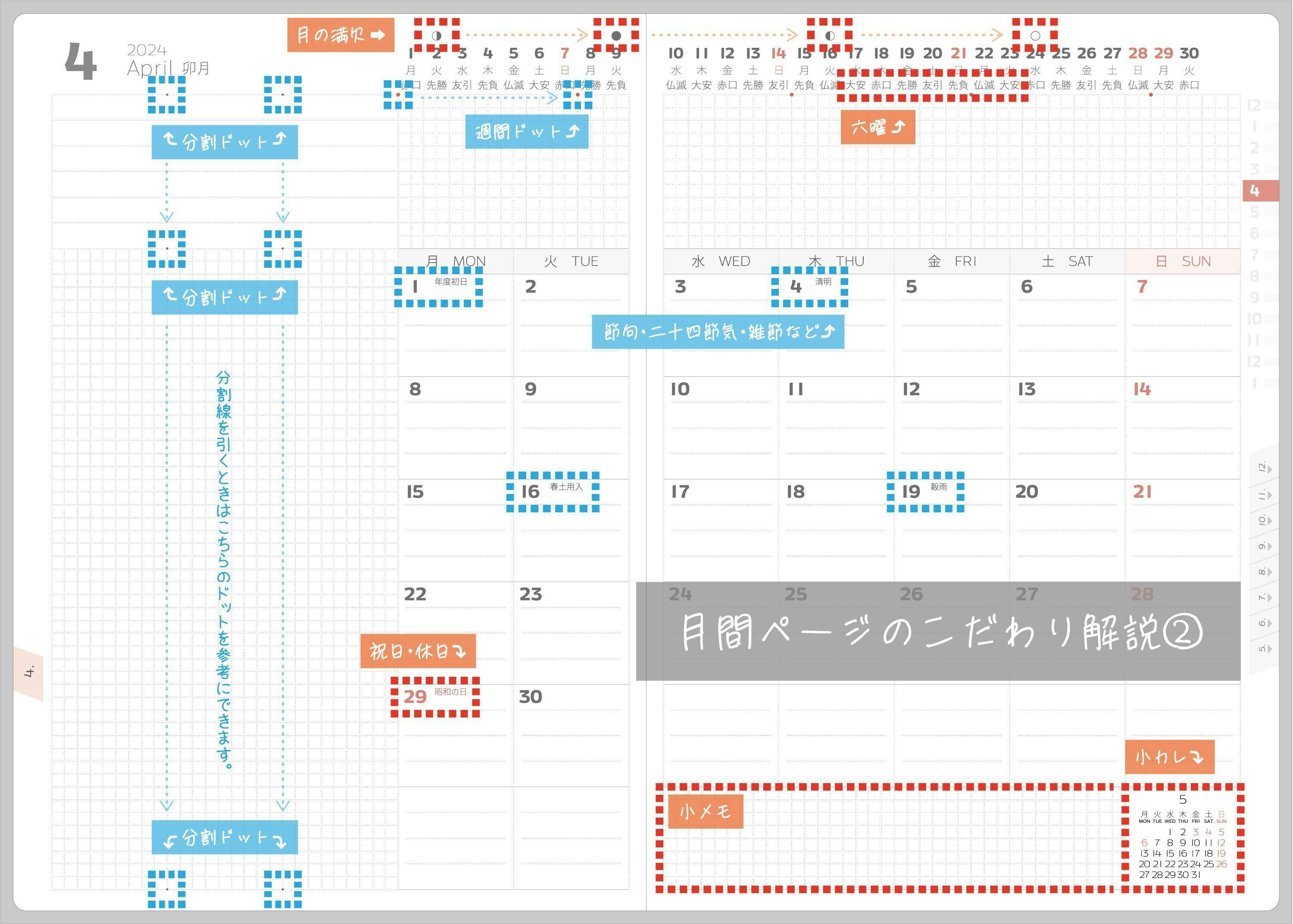 A:「2024年1月始まり手帳」または「卓上カレンダー」も商品化しており、1月始まり手帳は3シリーズをご用意しております。ただし、1月始まり手帳は「公式通販サイト」からのご購入の形となります。予めご了承ください。(※こちらで確認できます → 公式通販サイト)
