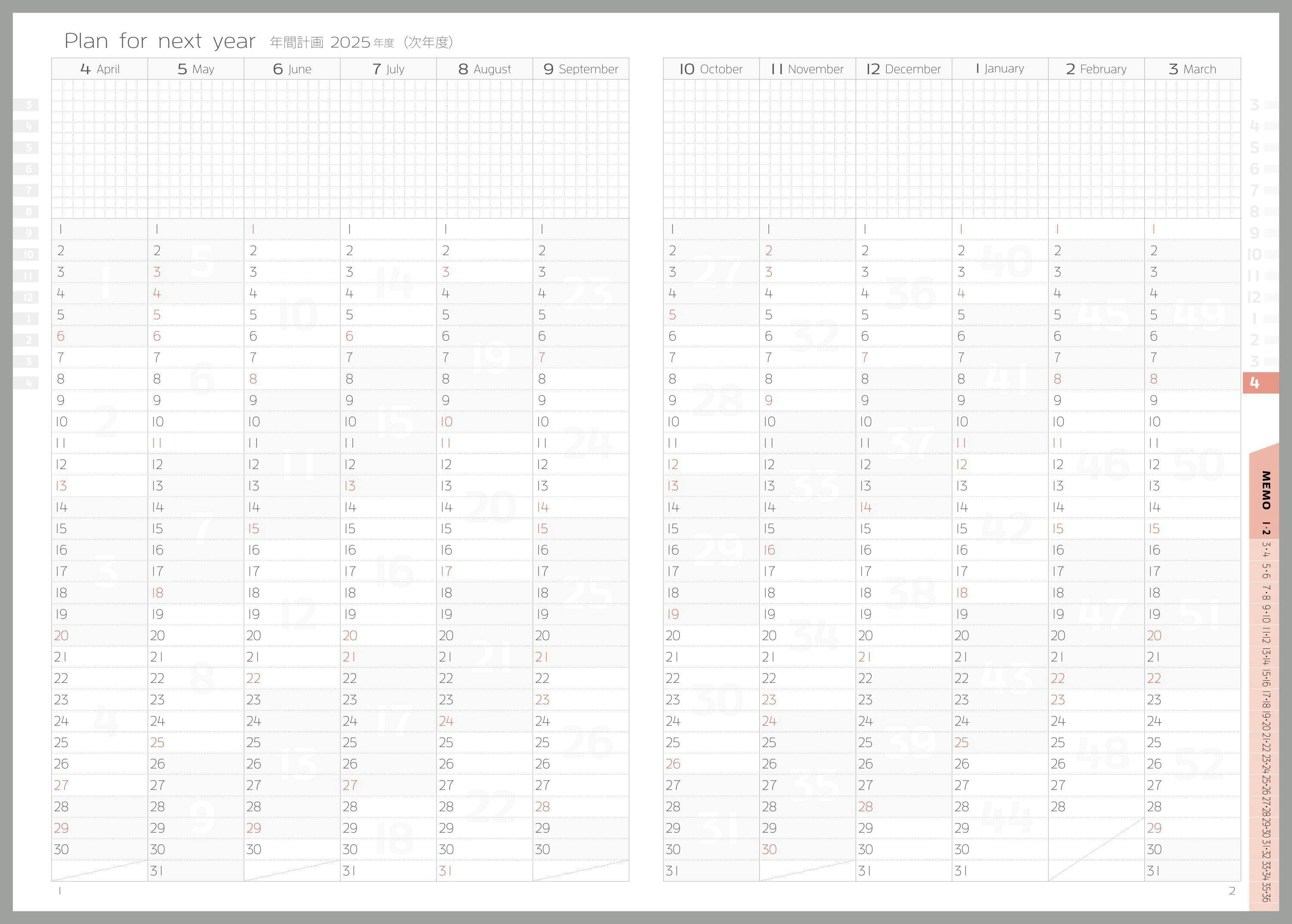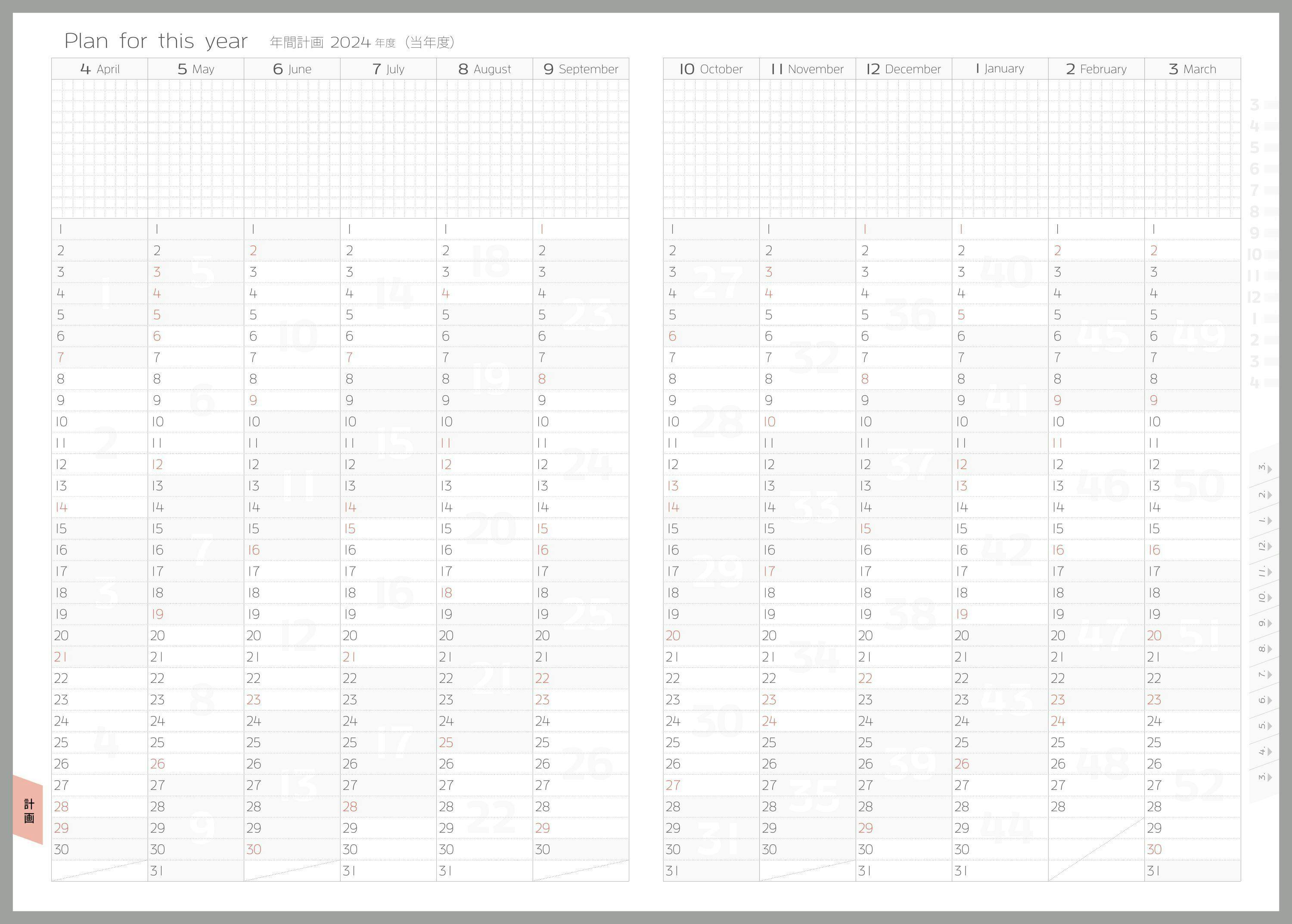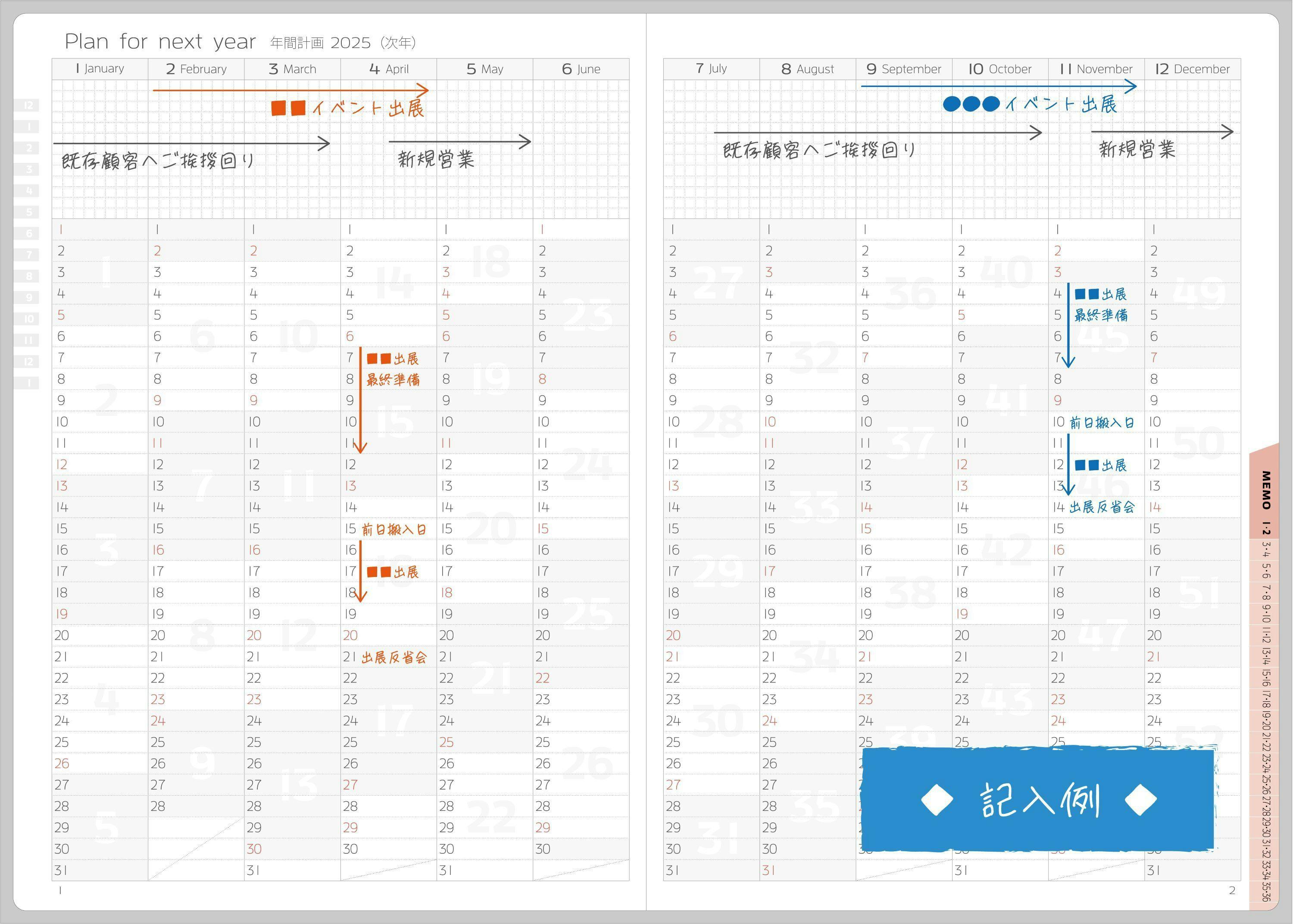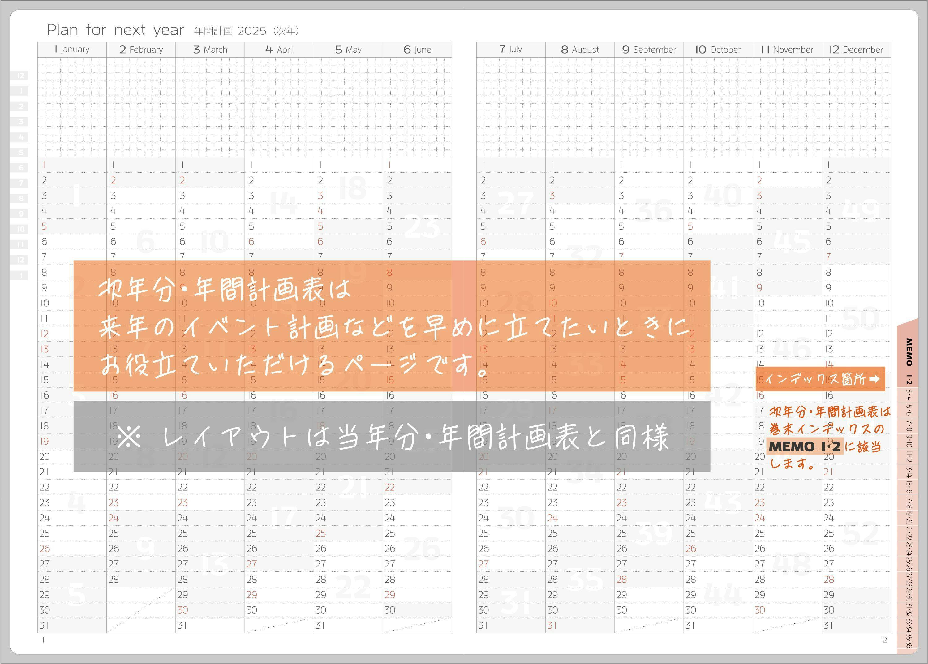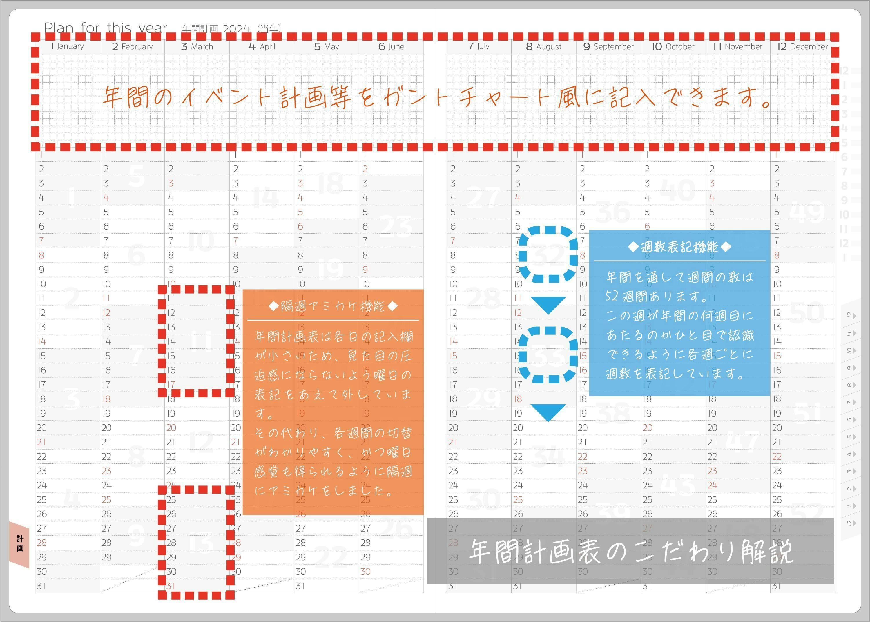 (※参考)月ごとに月間➡週間➡月間➡週間・・・のような流れのページ構成で上記の課題はある程度は解決できそうですが、年間通して一気通貫した記入&確認ができる最大のメリットを損なってしまうページ構成になってしまいます。