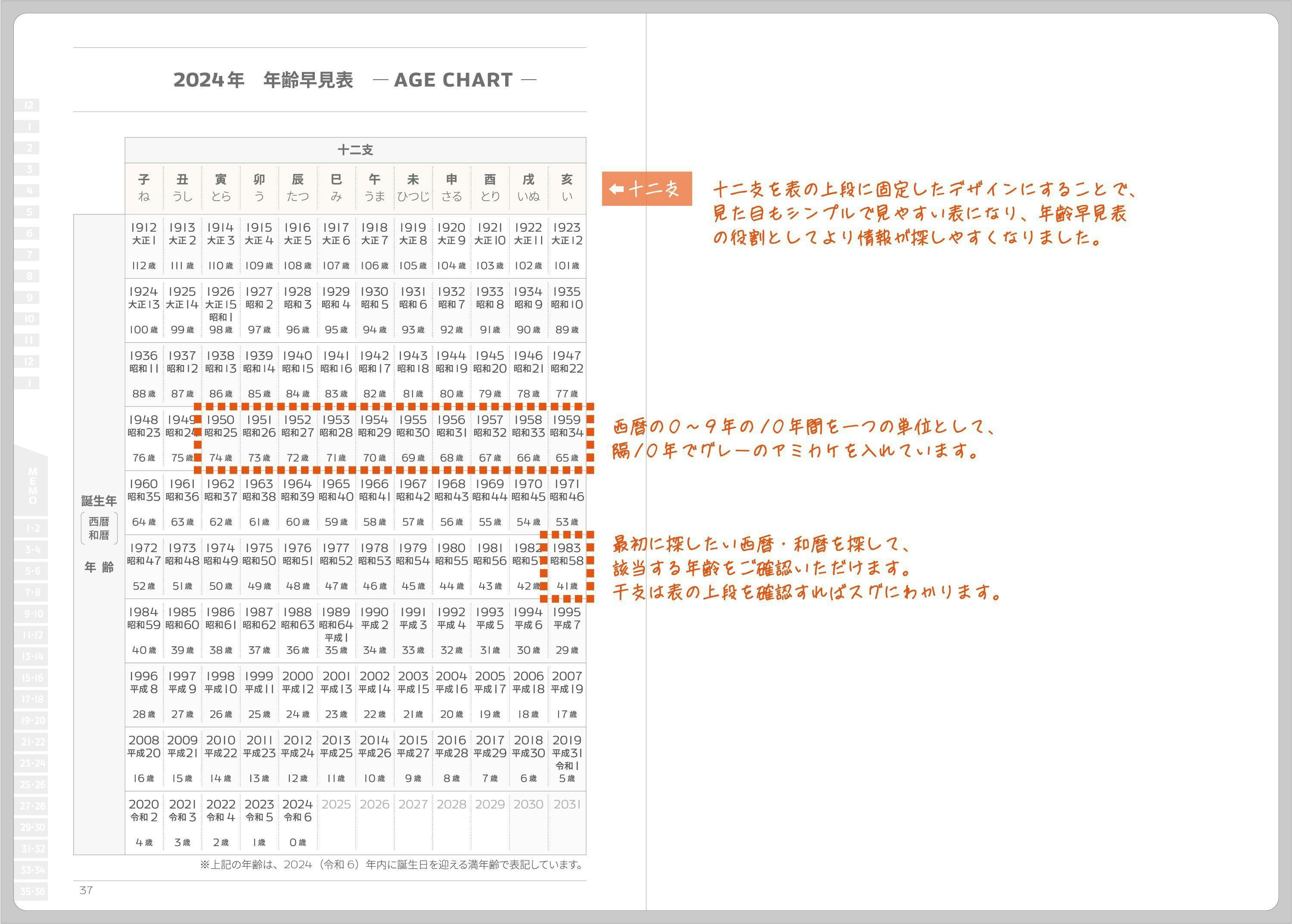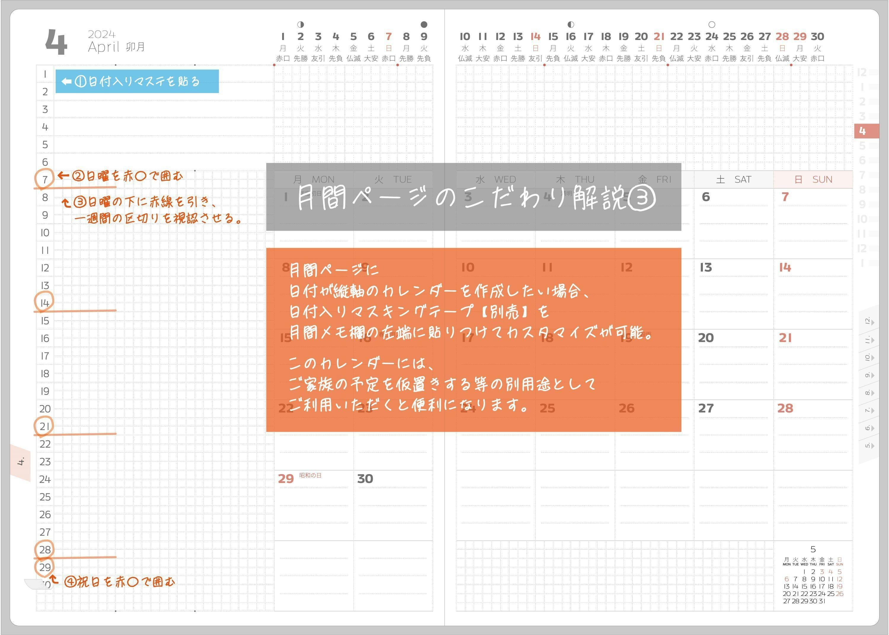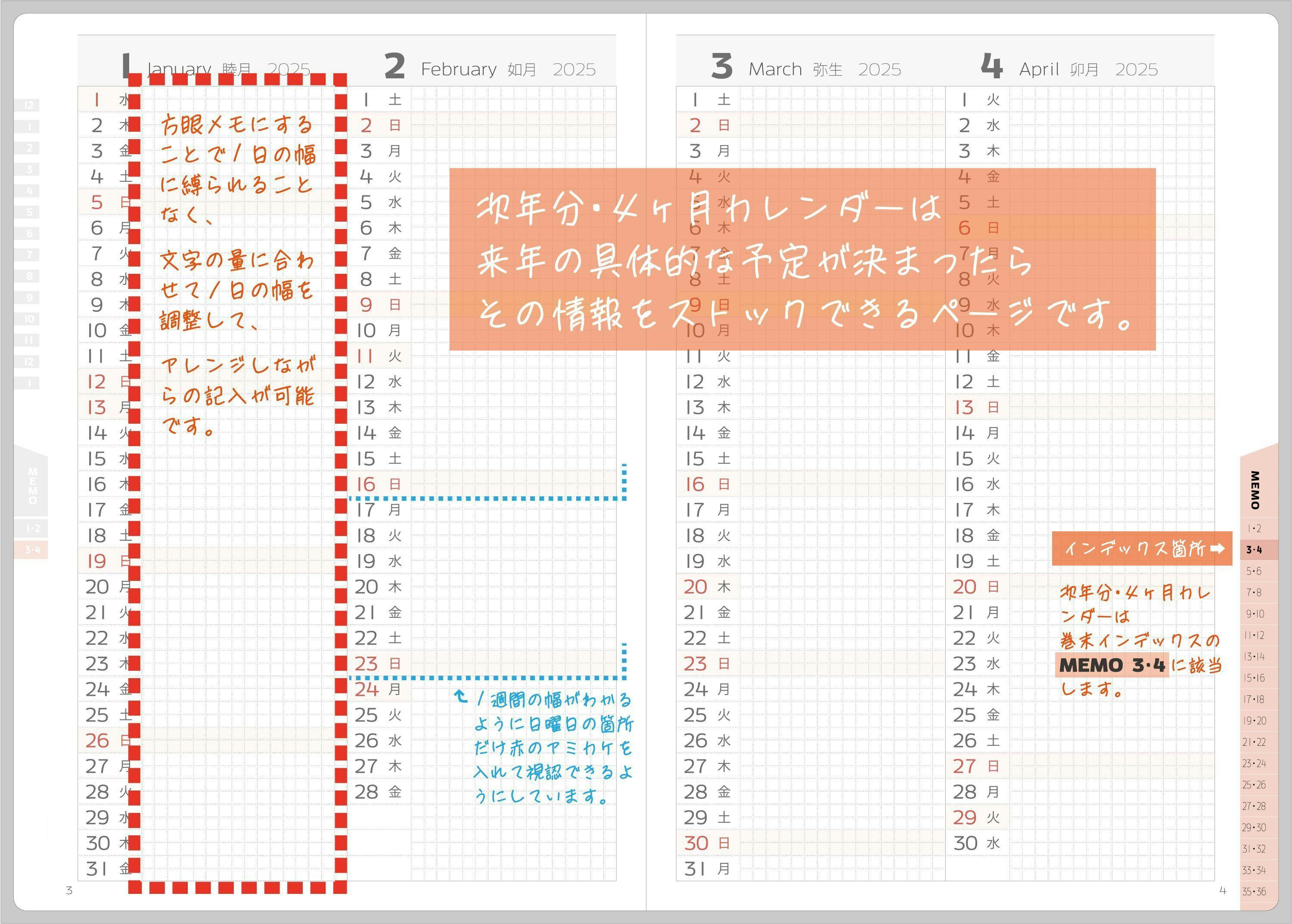 そして、このパラパラめくる動作をより効率的にするため、『通常の月間インデックス』の印字に加えて、独自の『遡りインデックス』を印字し、新たな不便を発生させない工夫も、当特許機能の特徴のひとつです。