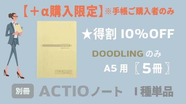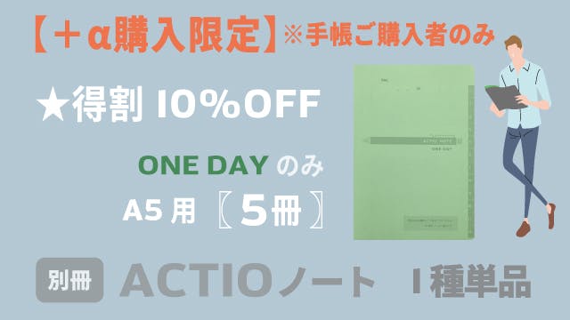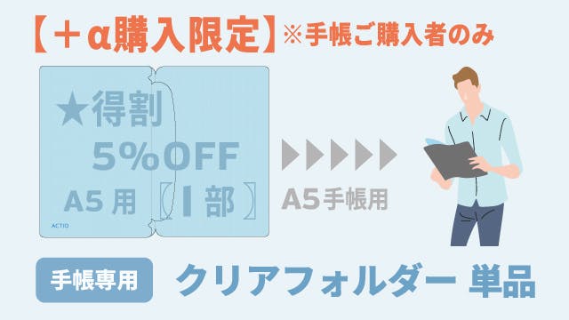 ※別冊ACTIOノート、手帳専用クリアフォルダーのお届けは、手帳本体または本革手帳カバーいずれか早い方とご一緒のご納品となります。