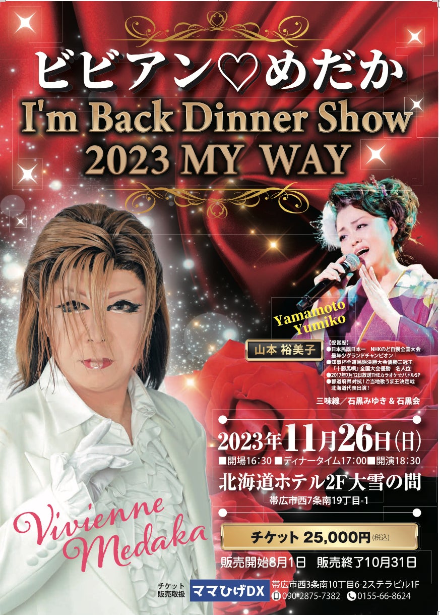 十勝を愛するエンターテイナー「ビビアン・めだか」は、2023年11月26日に地元タレントでは初になる北海道ホテルでフルコース・ディナーショーを開催いたします。