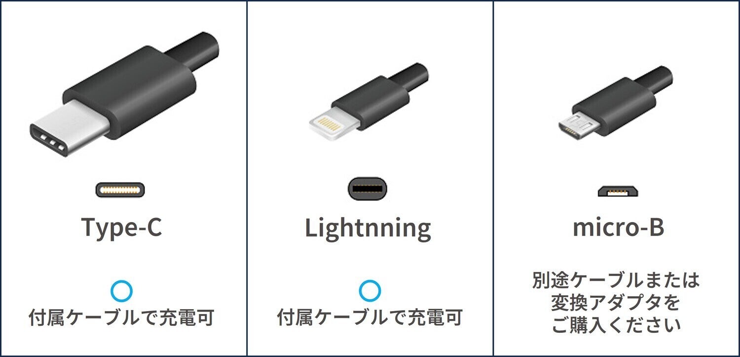 A. Type-C・Lightnningの端子は、本商品同封されているケーブルや変換アダプタで充電可能です。micro-Bの場合は別途ケーブルまたは変換アダプタの購入が必要です。