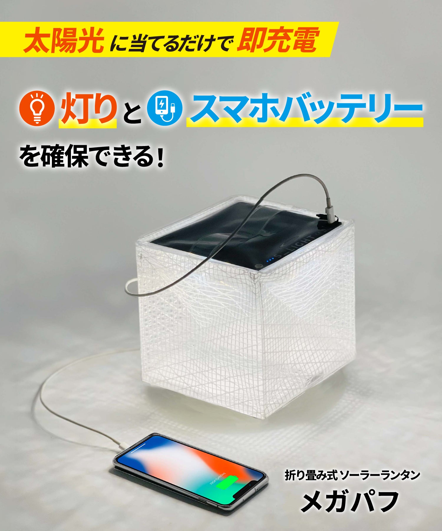 災害による停電やスマホバッテリー切れに備えて、灯りとスマホバッテリーの両方を確保しておかなければなりません。『メガパフ』は太陽光に当てるだけで充電可能な折り畳み式ソーラーランタンです。強力発光&長時間点灯、そしてスマホ充電機能を持っています。そのため、いつでも灯りとスマホバッテリーを確保できます。