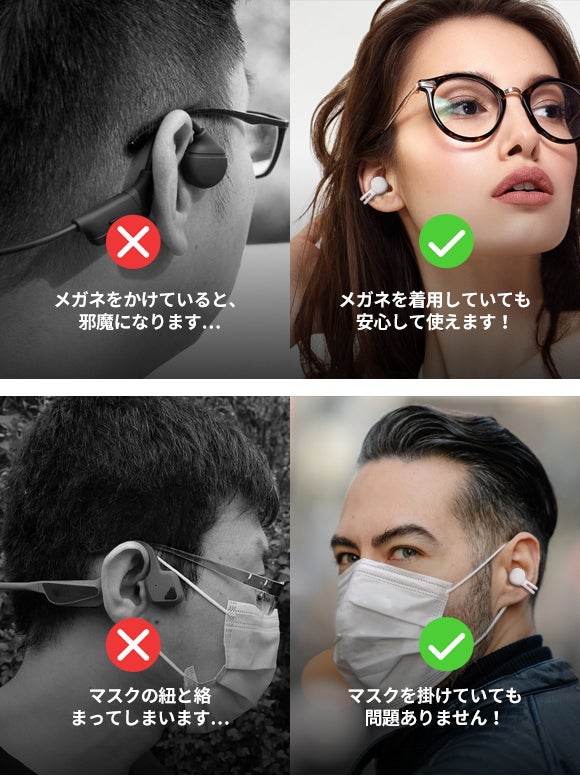 こめかみに挟み込むようにして装着するイヤホンタイプは、頭のサイズによって装着感が異なります。また、メガネやマスクに影響されて、人によってはフィットしない可能性もあります。
