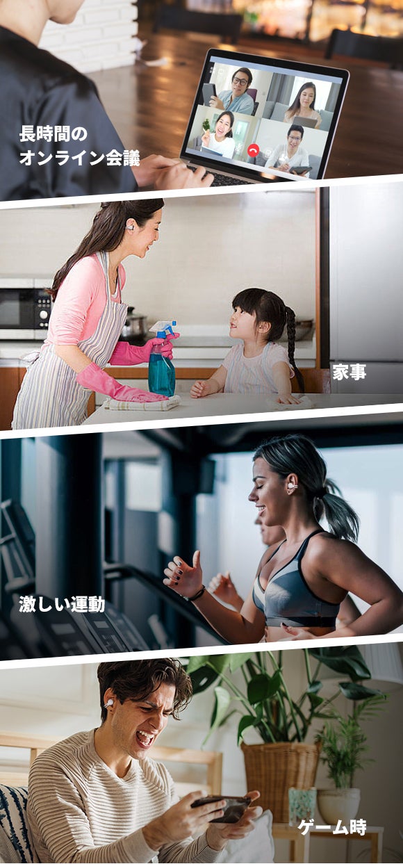 イヤホンの常識を覆す耳を塞がないイヤーカフ型は、テレワーク、スポーツ、移動中など、あらゆる場面で自由に音楽を楽しむことができます。また、耳への不快感を最小限に抑えるため、長時間つけていても疲れません。