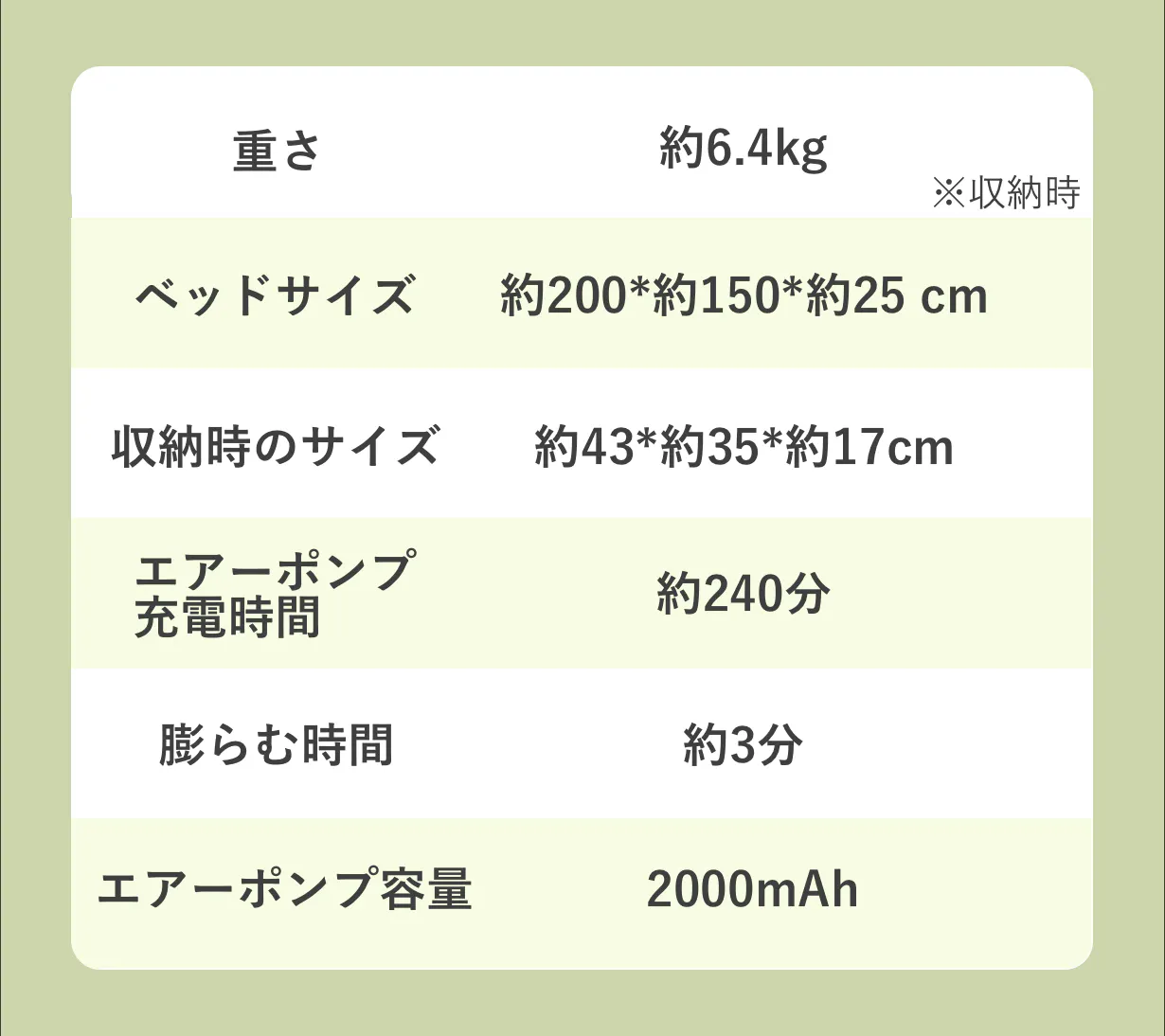 ボタン1つで自動的に空気の出入れが可能。2000mAhの大容量バッテリーのエアーポンプを搭載しており、わずか3分でベッドに空気を入れることができます。