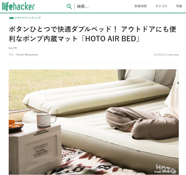 先日、Lifehackerで「アウトドアを更に充実させるエアベッド!【HOTO AIR BED】」を紹介して頂きました!