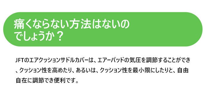 JFTエアクッションサドルカバーを取り付けることによって、座った瞬間にサドルカバー内の空気反力で体に掛かる圧力の80%を逃がすことができるので、腰とお尻への負荷を最低限に抑え、守ることができます。