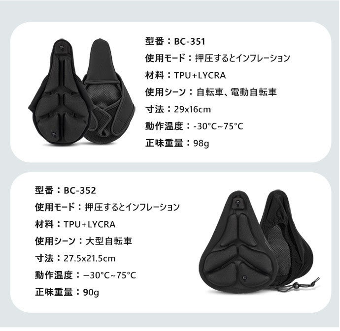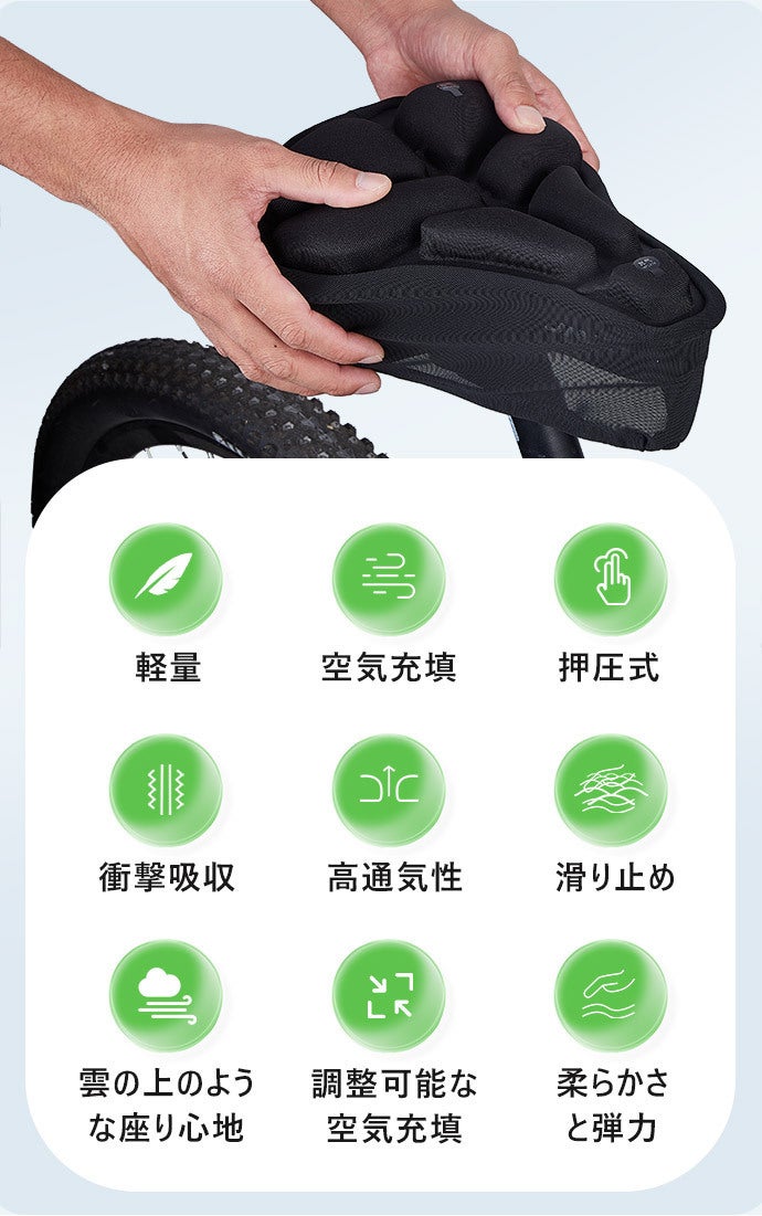 快適、ポータブル、調節可能。走行中にプロフェッショナルな保護を提供します。このエアクッションサドルカバーに座ると、まるで雲の上に座っているような気分になります。