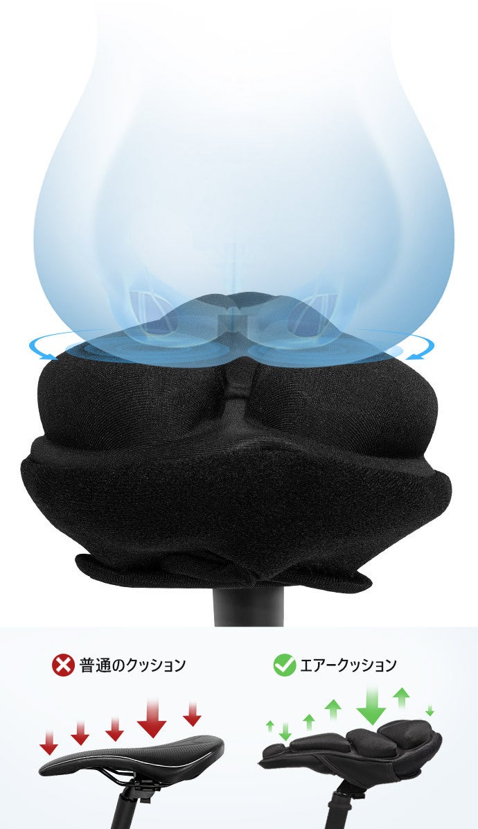 3Dエアバッグの厚さが約3cmであることにより、エアバッグ間の空気が循環し、走行時の発汗やムレが軽減されます。また、エアクッションサドルカバーは、柔らかくて弾力があるだけでなく、耐衝撃性も兼ね備えていますので、お尻への圧力負荷を分散し、尾てい骨に優しいです。