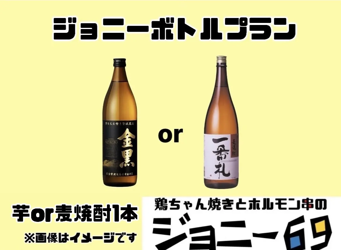 芋焼酎(金黒)もしくは麦焼酎(1番札)1本を、当店にてボトルキープさせて頂きます。