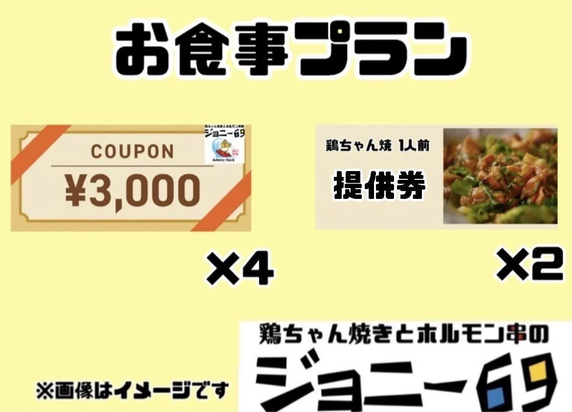 ジョニーで使えるお食事券3000円分クーポン×2枚+お好きな鶏ちゃん焼1人前提供券1枚