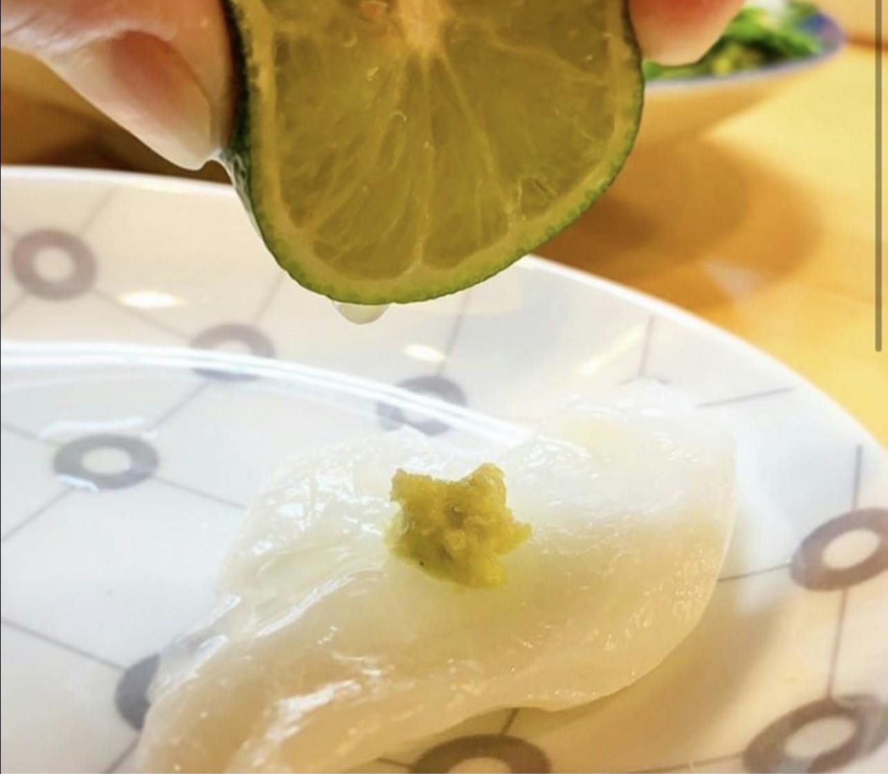 お寿司にすだちをかけています!イカや白身魚などの繊細な風味を損なうこと無く、奥にある甘さを引き出すすだちだと、たくさんの鮨職人の方からお褒めいただいています。