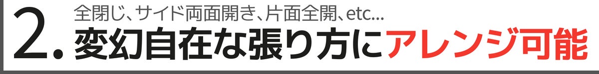 全閉じ・サイド両面開き・片面開きだけでなく、複数付いているループや最大240cmの4段階調整ポールを組み合わせて、様々な張り方にアレンジが可能です!