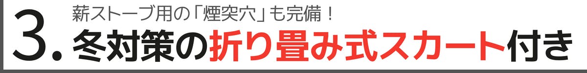 テント内への風や冷気の侵入を防ぐ「テントスカート」も標準装備。しかも、スカート付きテントとしては珍しい「折り畳み式」を採用しました!冬場は暖かく夏場は丸めて通気性を高められる構造です!