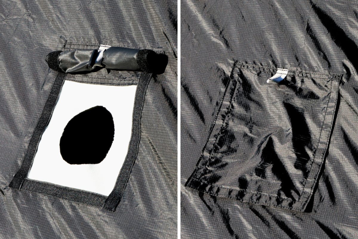 冬はテントの中で「薪ストーブ」を使いたい人も多いはず。薪ストーブの煙を外に出すための煙突穴を標準装備しました。使わないときは隠せる仕様にしているので夏場でも違和感なく使えます!