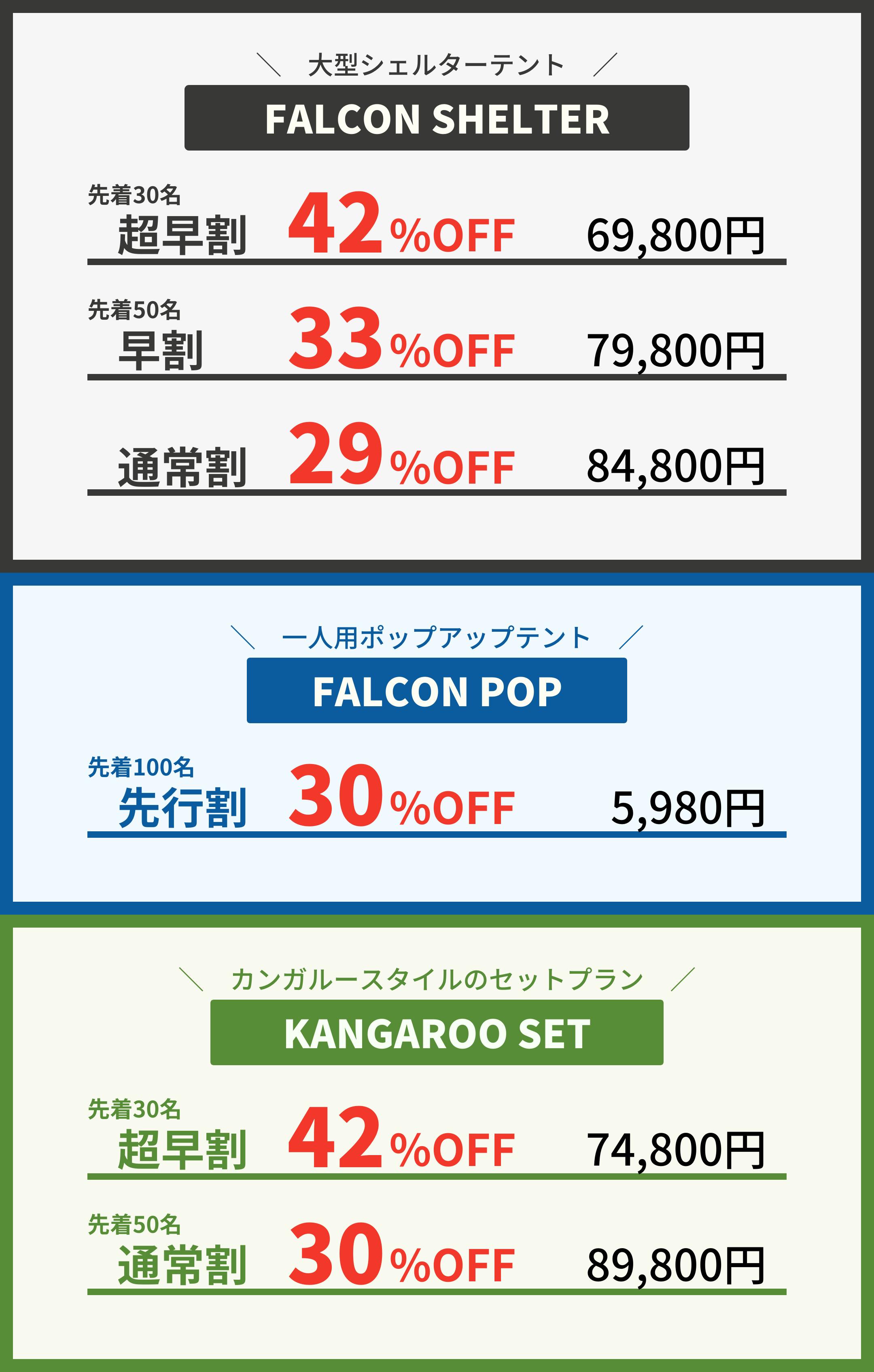 大型シェルターテント「 FALCON SHELTER 」とポップアップテント「 FALCON POP 」をセットで購入したい人向けに【 カンガルーセット 】も用意させていただきました!!