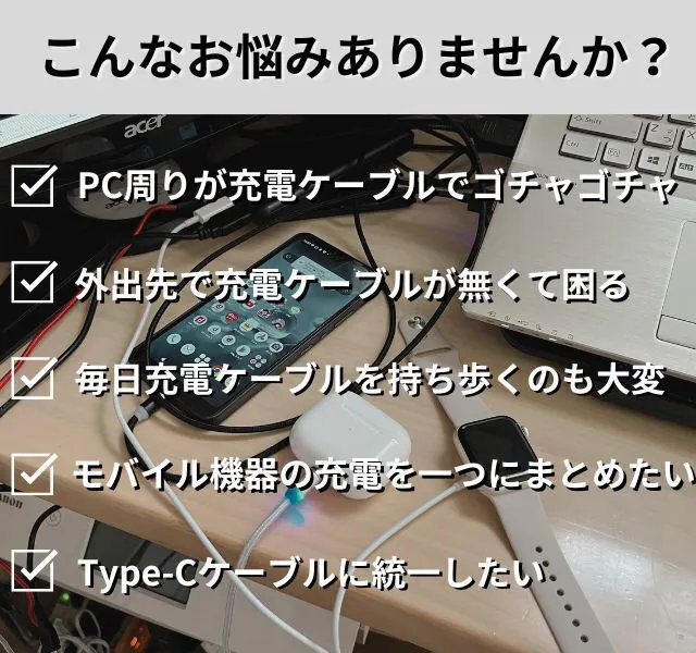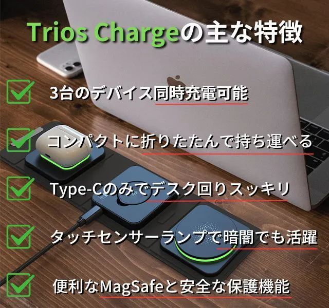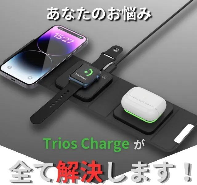 私自身がモバイルデバイスの愛用者であり、iPhone、Apple Watch、AirPodsなどを別々に充電する手間やケーブルの煩わしさを解消したいと毎日思ってました。そんな時に「Trios Charge」に出会いました。