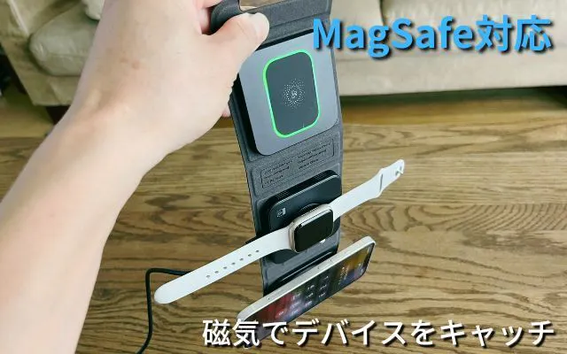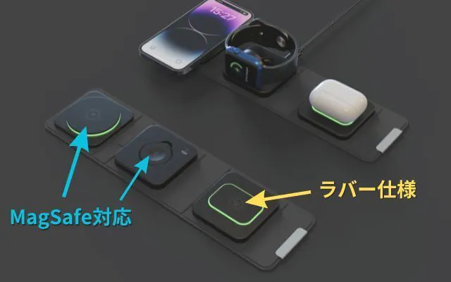 Apple WatchとAirPodsにはそれぞれ専用の充電ドックが設けられており、AppleWatch専用ドックにはMagSafe、プラス窪み、AirPodsはラバーでしっかりキャッチします。
