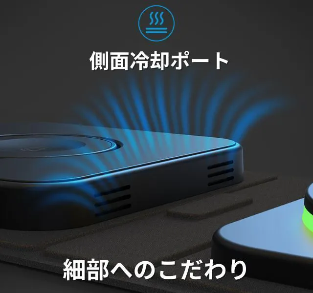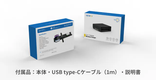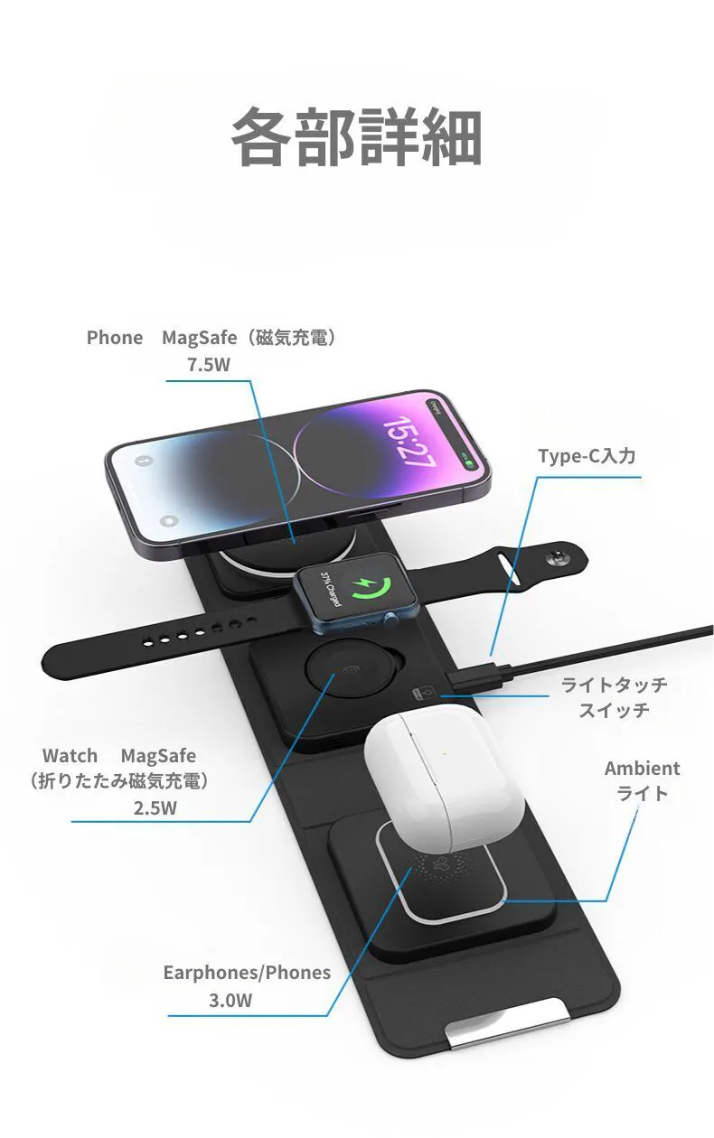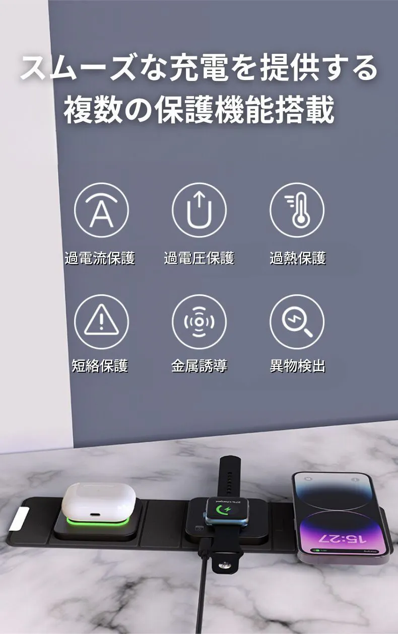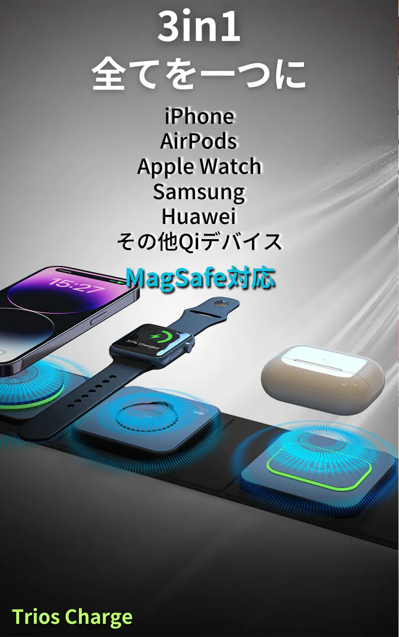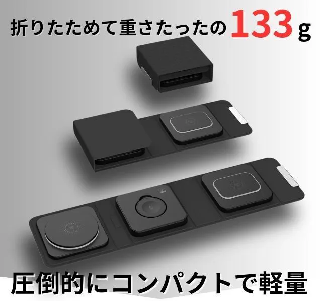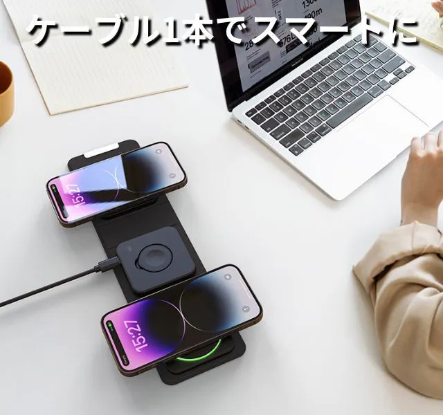 当社のワイヤレス充電器は、iPhone、Apple Watch、AirPodsの3つのデバイスを同時に充電できる製品です。コンパクトなサイズで持ち運びに便利でありながら、強力な充電性能を提供します。