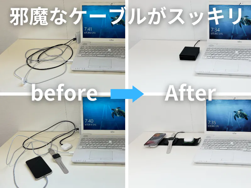 「Trios Charge」は複数のワイヤレス機器をまとめて充電することが出来るので、充電ケーブルをいくつも用意する必要ありません。