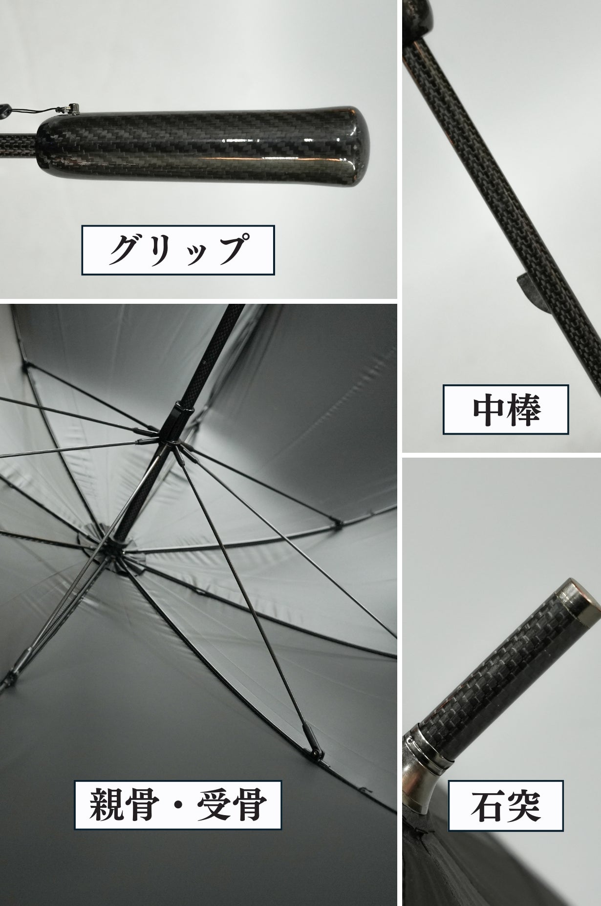 傘の先っぽにある石突から、手元のグリップまで、使えるところには全てカーボンファイバーを使用したこだわりの長傘です。