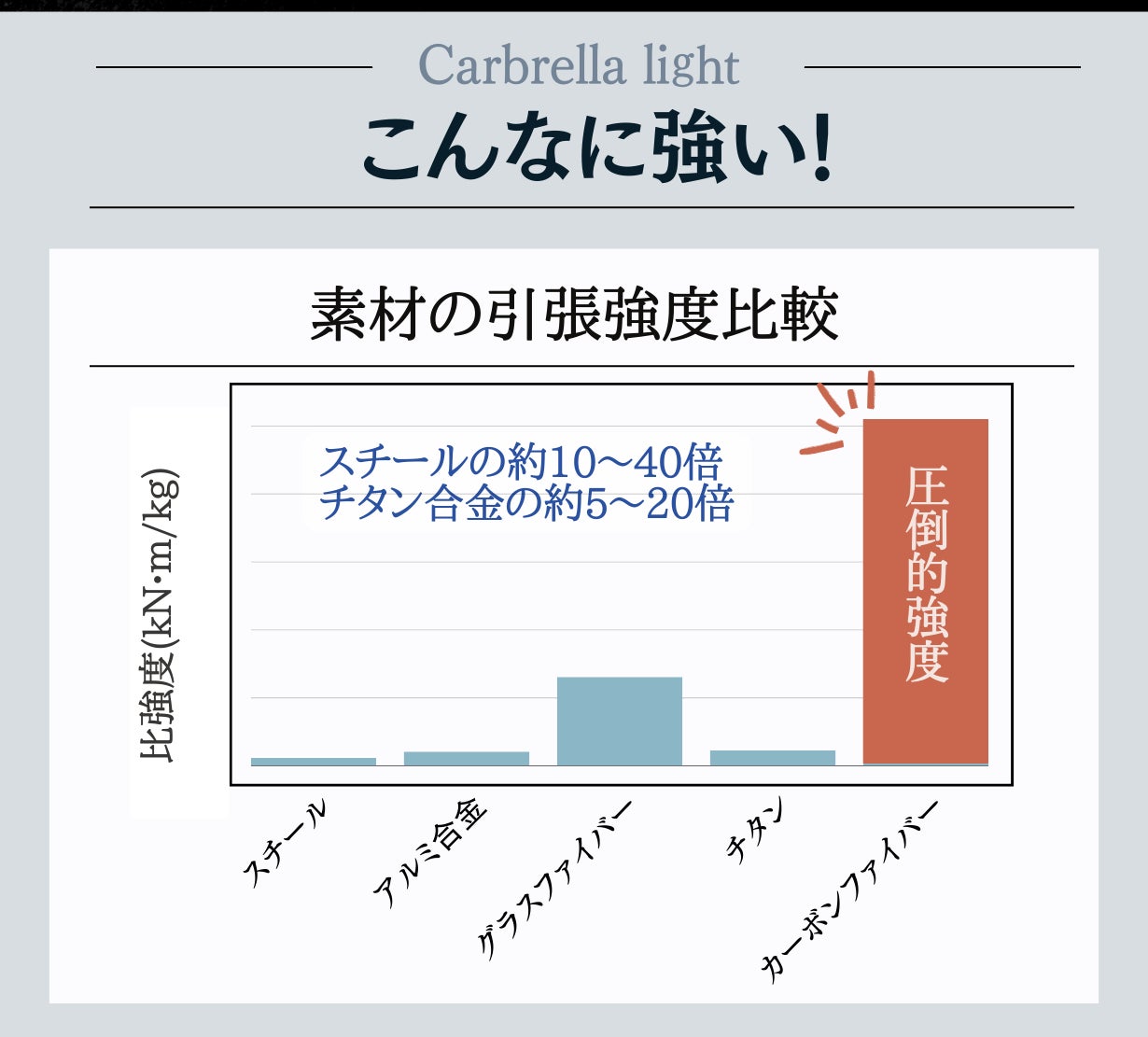 カーボンファイバーは航空機やロケットに使用される、鉄の10倍の比強度と鉄の4分の1の比重を持つ先端素材です。金属ではないので錆びることはありません。