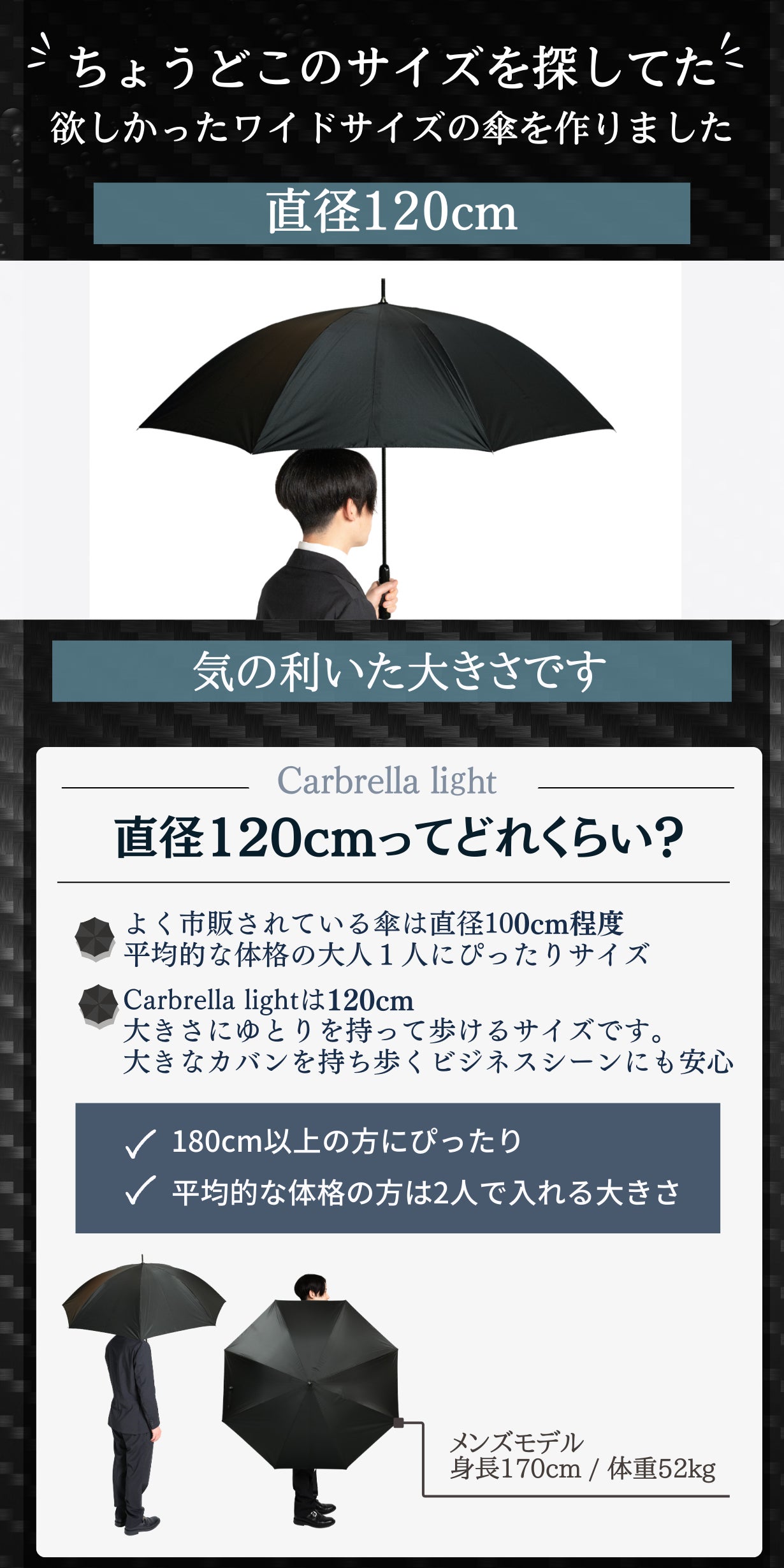今回ご紹介するのはそんなお悩みを解決する、軽くて大きなカーボンファイバー製の長傘です!