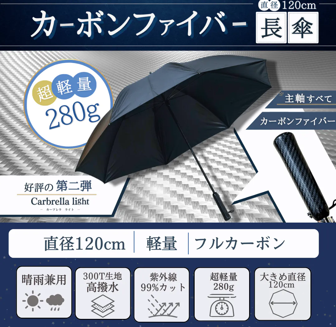 【驚きの軽さ・大きさ】大きめの直径120cmと超軽量280gのフルカーボン傘!の