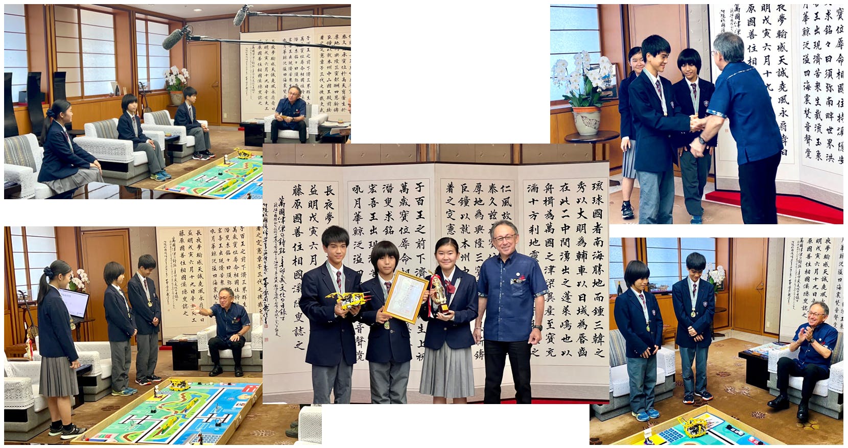 10月中旬、Amicus YTS の3名が沖縄県の玉城知事を表敬訪問致しました。最初に玉城知事と名刺交換をさせていただき、その後、実際にロボットを走らせながら、玉城知事に競技内容を説明しました。