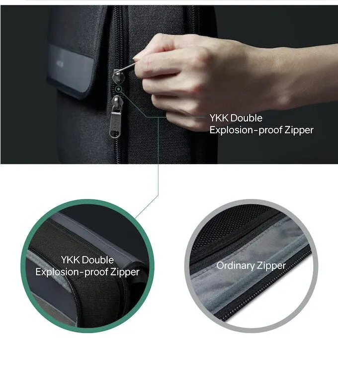 スーツケースでの被害が目立つ、バッグのピッキング行為に強い「YKK不正開閉防止ファスナー」をメインコンパートメントと、PC向けポケットの両方に搭載しています。