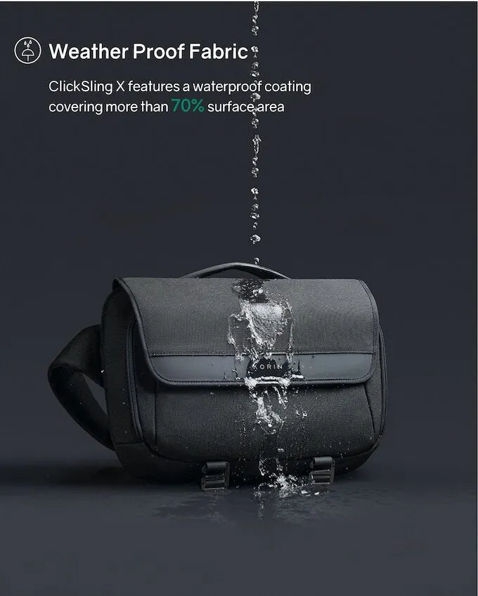 ClickSling Xは表面の70%を防水加工を施した素材を使用し撥水性を高めているため、防水加工と大きなフラップ(フタ部分)の相乗効果でちょっとした雨でしたら中まで侵入しにくい仕様となっております。