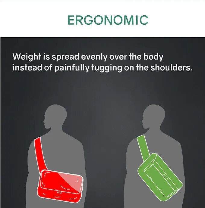 これだけの機能を詰め込んだClickSling Xには、沢山のものを詰め込んで毎日お使いいただけるような設計となっていることはおわかりになっていただけたと思いますが、そのカバンを快適にお使いいただくために、荷物の重みを分散させる設計や、