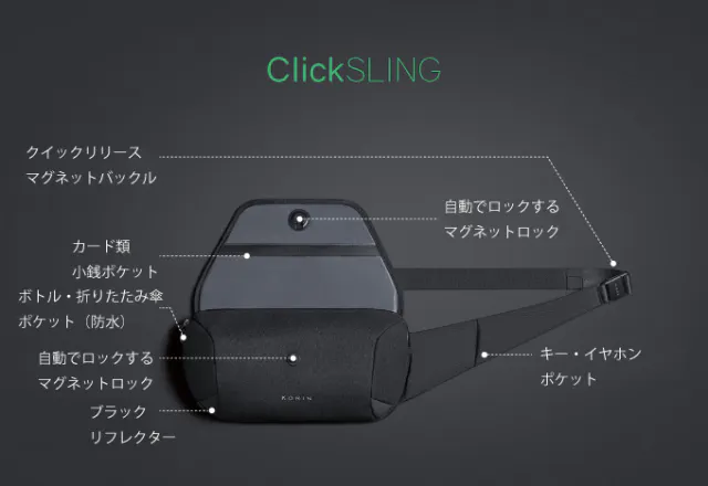 ClickSling Xには、防刃素材、YKK不正開閉防止ファスナー、撥水素材、大きなリフレクターを搭載した「毎日使える」安全設計の高機能バッグです。