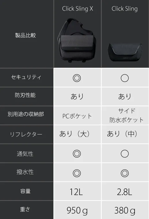 ClickSling X と ClickSling大きさ以外は何が違うの?と思われるお客様も多いかと思います。下記の表を参考にしてください。