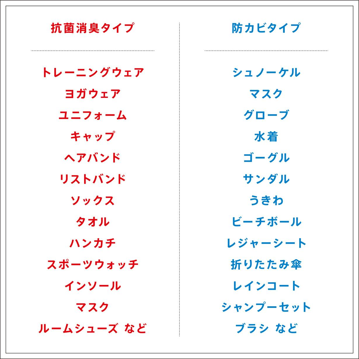 汗で濡れたものを入れる際には抗菌消臭タイプを、それ以外では防カビタイプをおすすめします。
