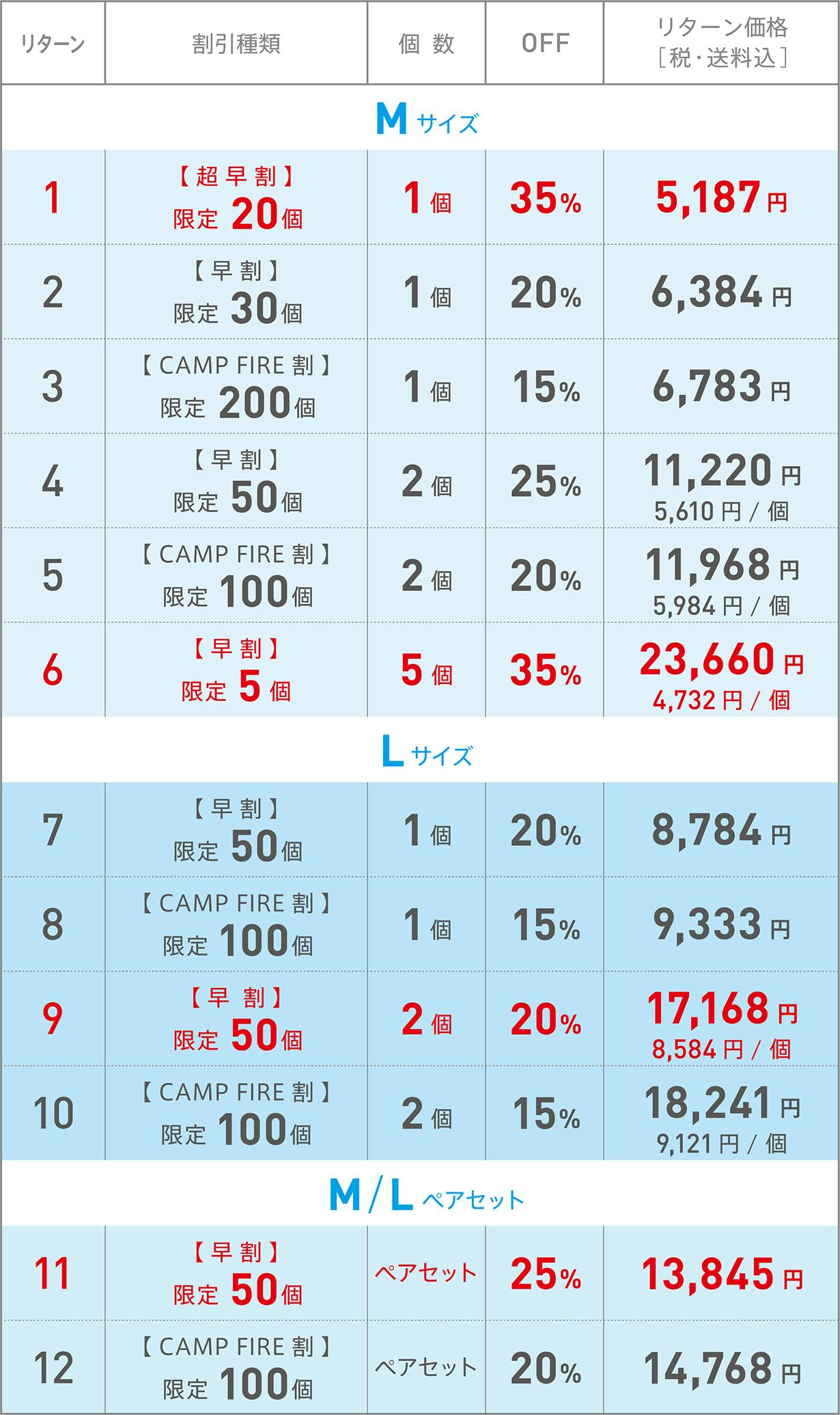 プロジェクト開始時のご支援に感謝を込めて、高い割引率のリターンをご用意しました。