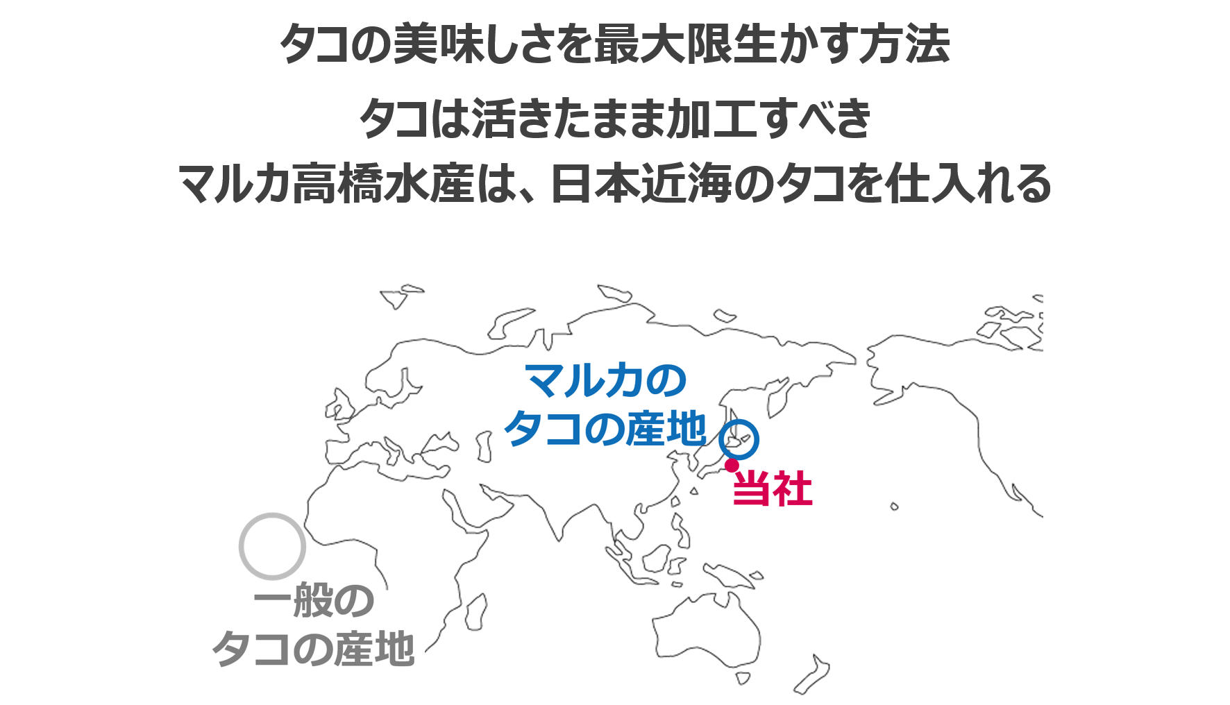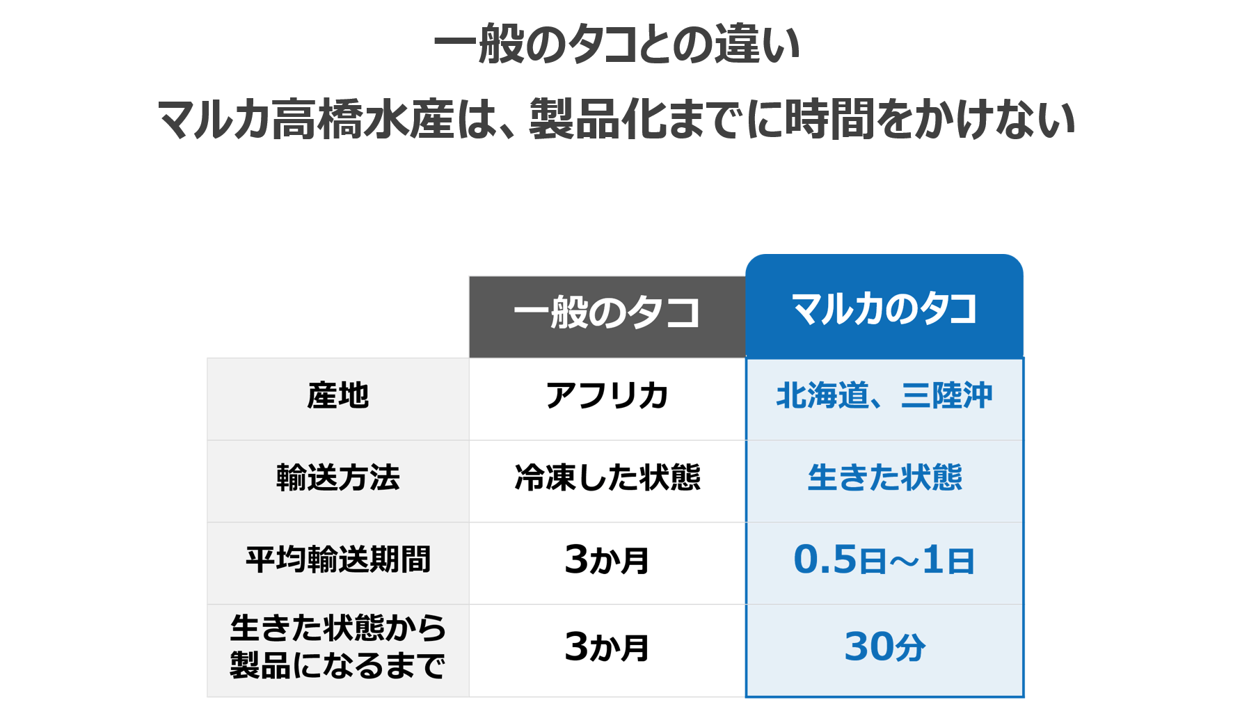 • 皆さまいつもお世話になっております。マルカ高橋水産の高橋です。弊社のタコの美味しさ紹介の続きです。タコの美味しさをご紹介 #5|マルカ高橋水産のタコと一般のタコの違い前回までの活動報告で、水揚げしてから加工場に届くまでの時間が長いため途中で冷凍せざるを得ず、結果として解凍時に味が落ちてしまうという「一般のタコ」の話と、冷凍せずに加工場に届けられる距離のタコに限定して仕入れを行っている「マルカ高橋水産のタコ」の話をしてまいりました。今日はこの話の締めくくりとして、一連の情報をまとめてみたいと思います。図のように、一般のタコは活きた状態から製品になるまで平均で3か月かかりますが、マルカ高橋水産の場合なんと『30分』で済んでしまいます。この差が美味しさの秘密だったというわけです。ここまで長い話にお付き合いくださり、ありがとうございました!プロジェクトはもう少し続きますので、お近くのタコ好きの方がいらっしゃったらぜひお薦めしてください。よろしくお願いいたします。 もっと見る