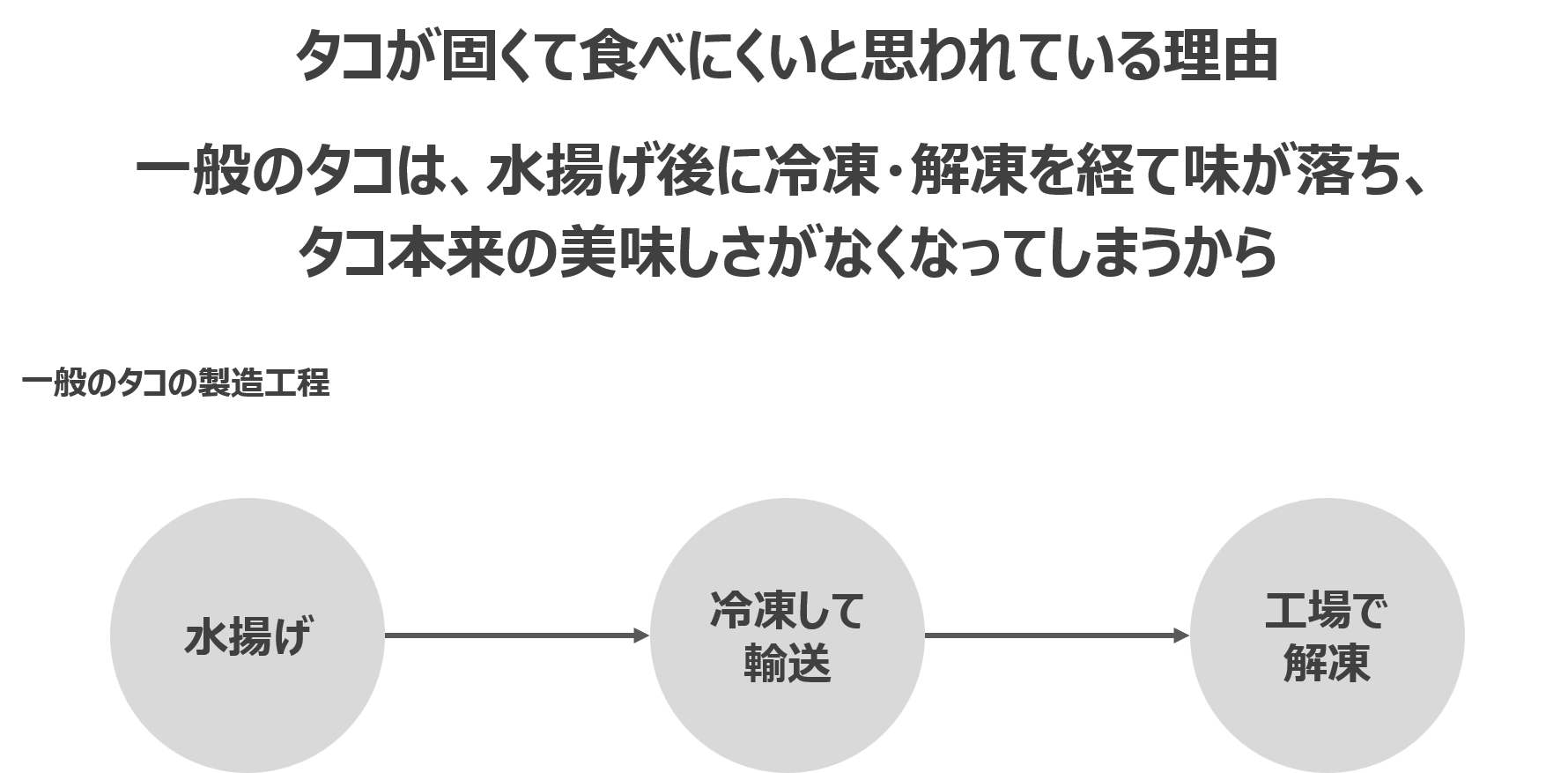 皆さまいつもお世話になっております。マルカ高橋水産の高橋です。弊社のタコの美味しさ紹介の続きです。タコの美味しさをご紹介 #5|マルカ高橋水産のタコと一般のタコの違い前回までの活動報告で、水揚げしてから加工場に届くまでの時間が長いため途中で冷凍せざるを得ず、結果として解凍時に味が落ちてしまうという「一般のタコ」の話と、冷凍せずに加工場に届けられる距離のタコに限定して仕入れを行っている「マルカ高橋水産のタコ」の話をしてまいりました。今日はこの話の締めくくりとして、一連の情報をまとめてみたいと思います。図のように、一般のタコは活きた状態から製品になるまで平均で3か月かかりますが、マルカ高橋水産の場合なんと『30分』で済んでしまいます。この差が美味しさの秘密だったというわけです。ここまで長い話にお付き合いくださり、ありがとうございました!プロジェクトはもう少し続きますので、お近くのタコ好きの方がいらっしゃったらぜひお薦めしてください。よろしくお願いいたします。