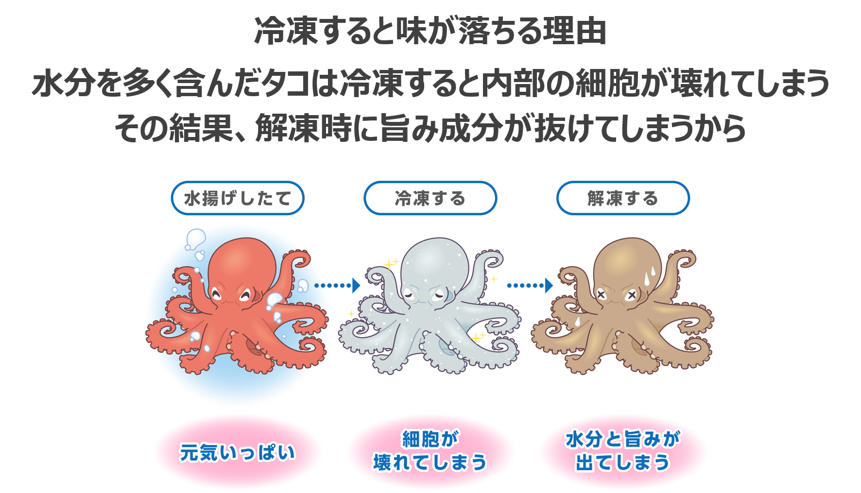 皆さまいつもお世話になっております。マルカ高橋水産の高橋です。先日告知した、弊社のタコの美味しさ紹介の続きです。タコの美味しさをご紹介 #3|冷凍すると味が落ちる理由それは「タコが水分を多く含んだ食材だから」というのが理由です。まずは前回ご説明した3つのステップをおさらいします。1.海で水揚げ2.冷凍して工場へ輸送3.工場について解凍し加工このうち、2と3で問題が発生します。水分を多く含んだタコを冷凍すると、冷凍時の圧力によってタコ内部の細胞が壊されてしまいます。この状態で解凍すると、細胞内に格納されていた水分と旨み成分が一気に抜け出てしまい、味が落ちてしまうという格好です。次回は11/1(水)に、味が落ちないためにマルカ高橋水産が行っている工夫についてご紹介したいと思います。お気に入り登録をしてお楽しみにしていてください!
