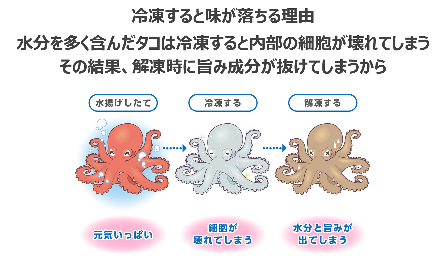 水分を多く含んだタコを冷凍すると、冷凍時の圧力によってタコ内部の細胞が壊されてしまいます。