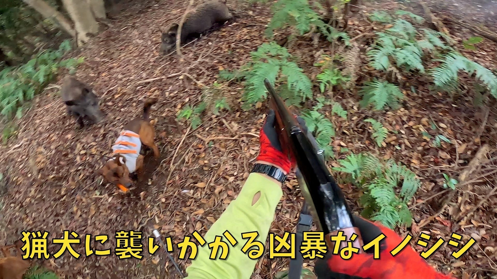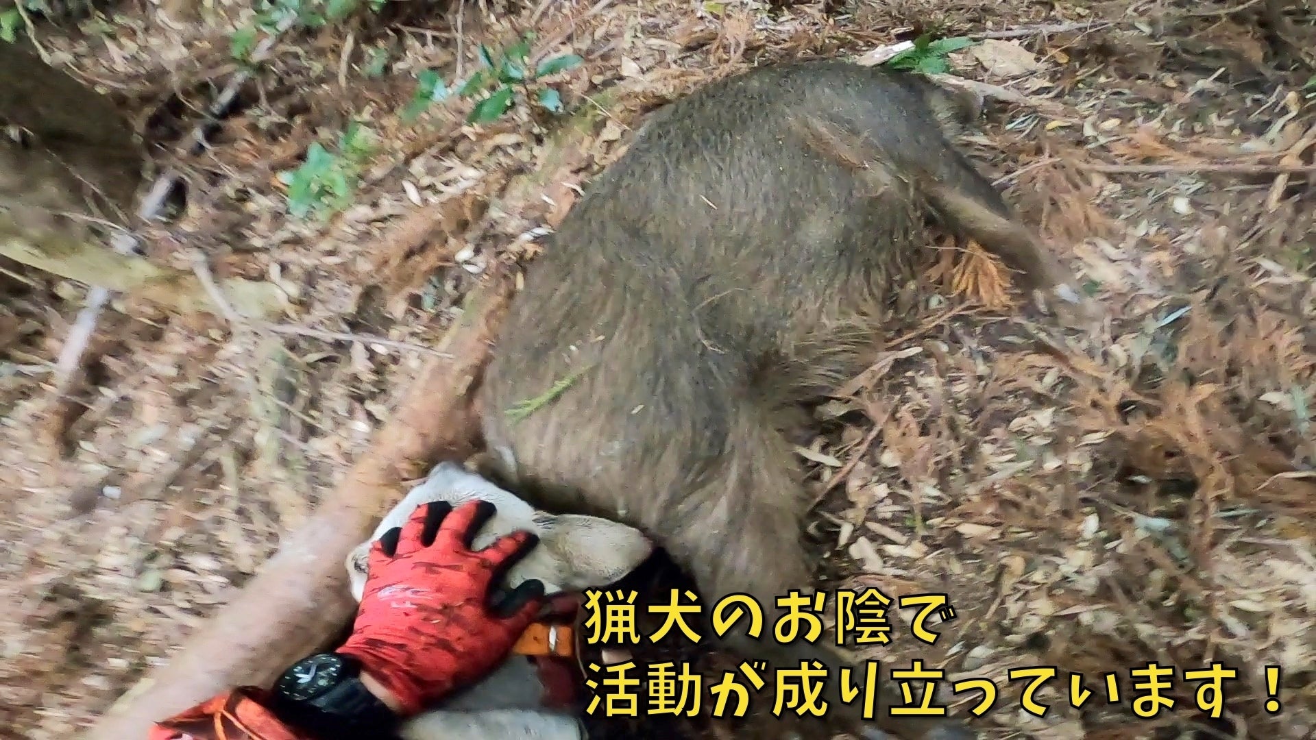 猟犬が見つけてくれたイノシシを捕獲しています。