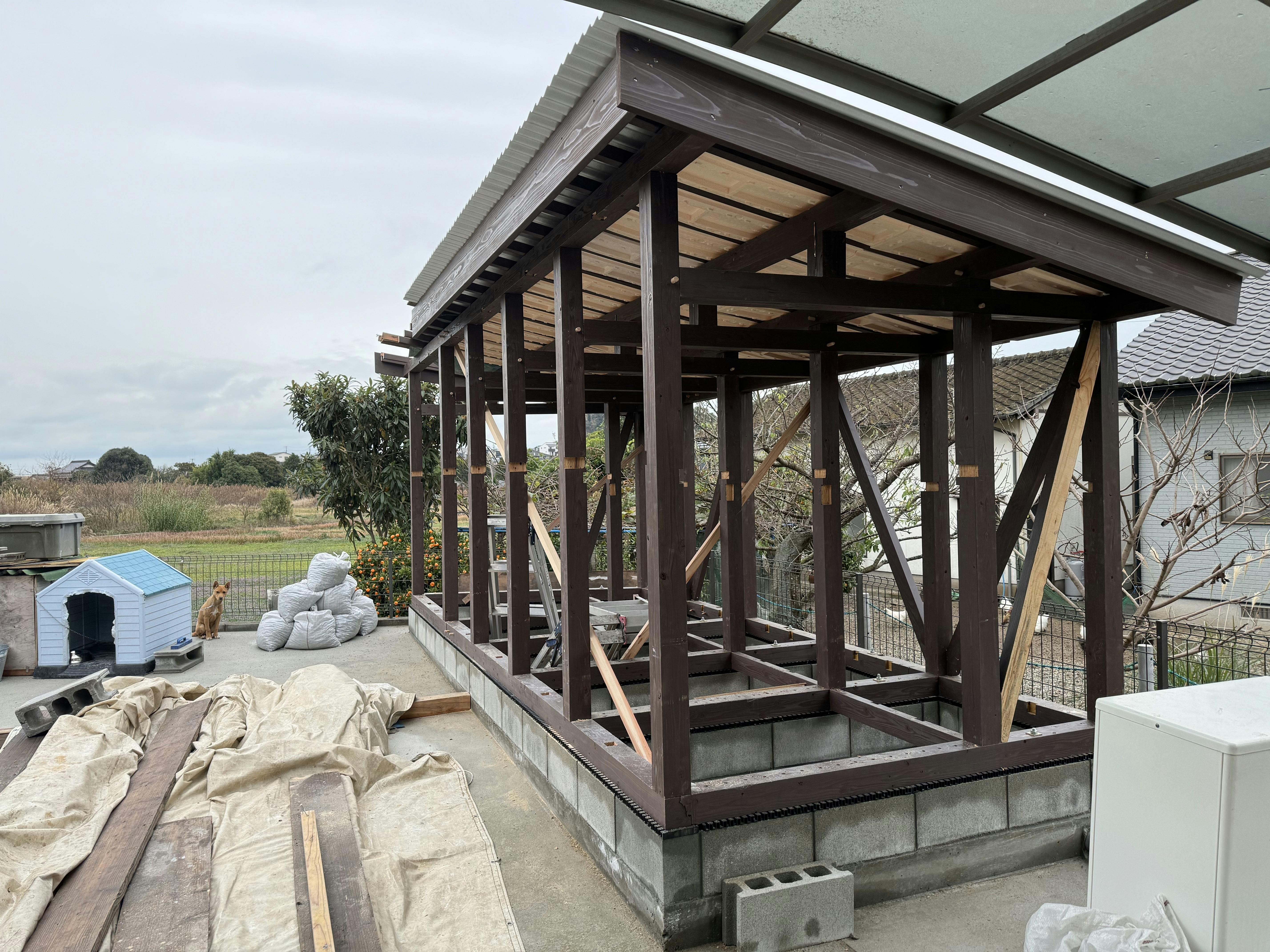 柱はシロアリ防止で塗装されていて、屋根には発泡素材の断熱材が入っています。