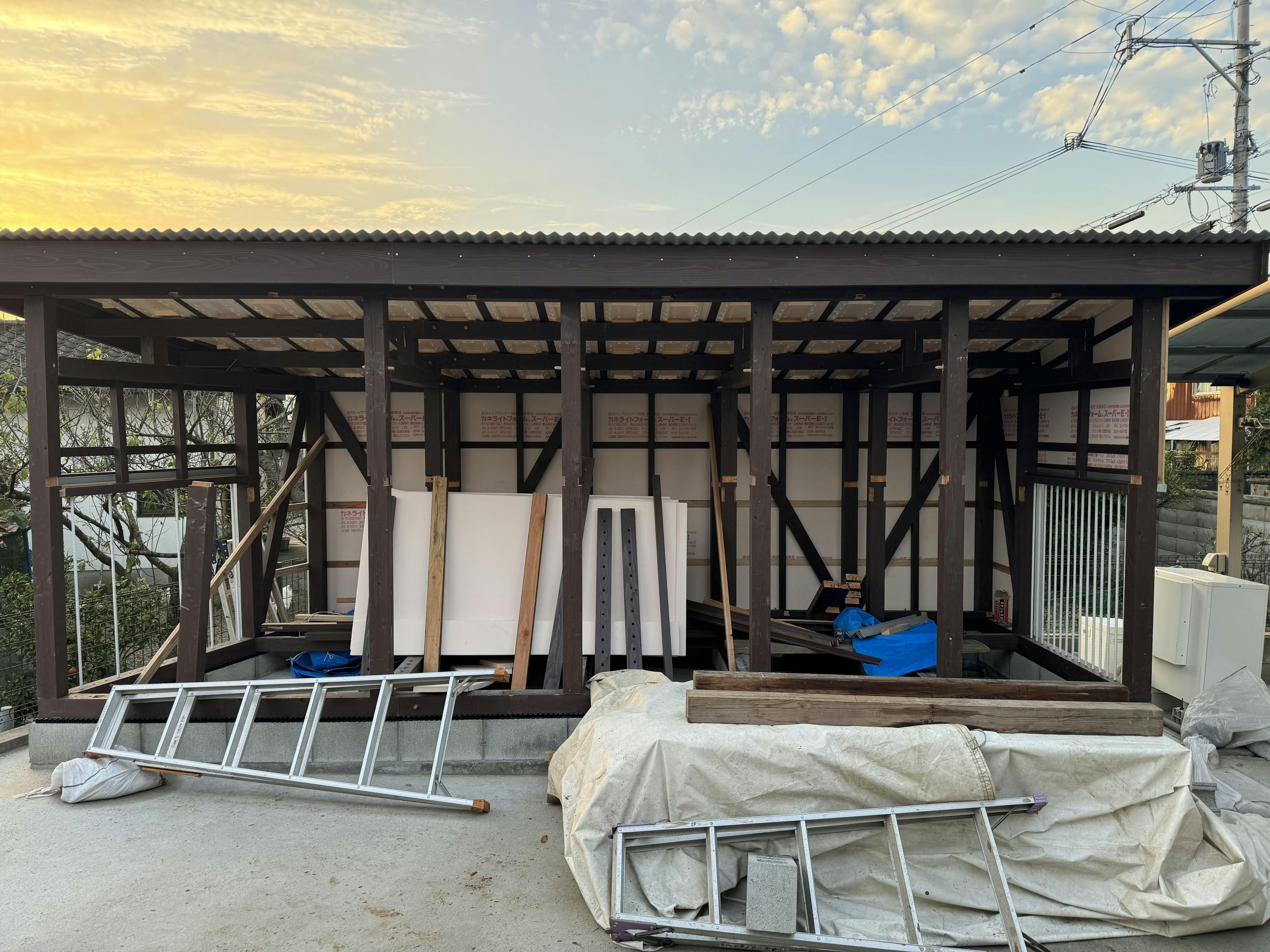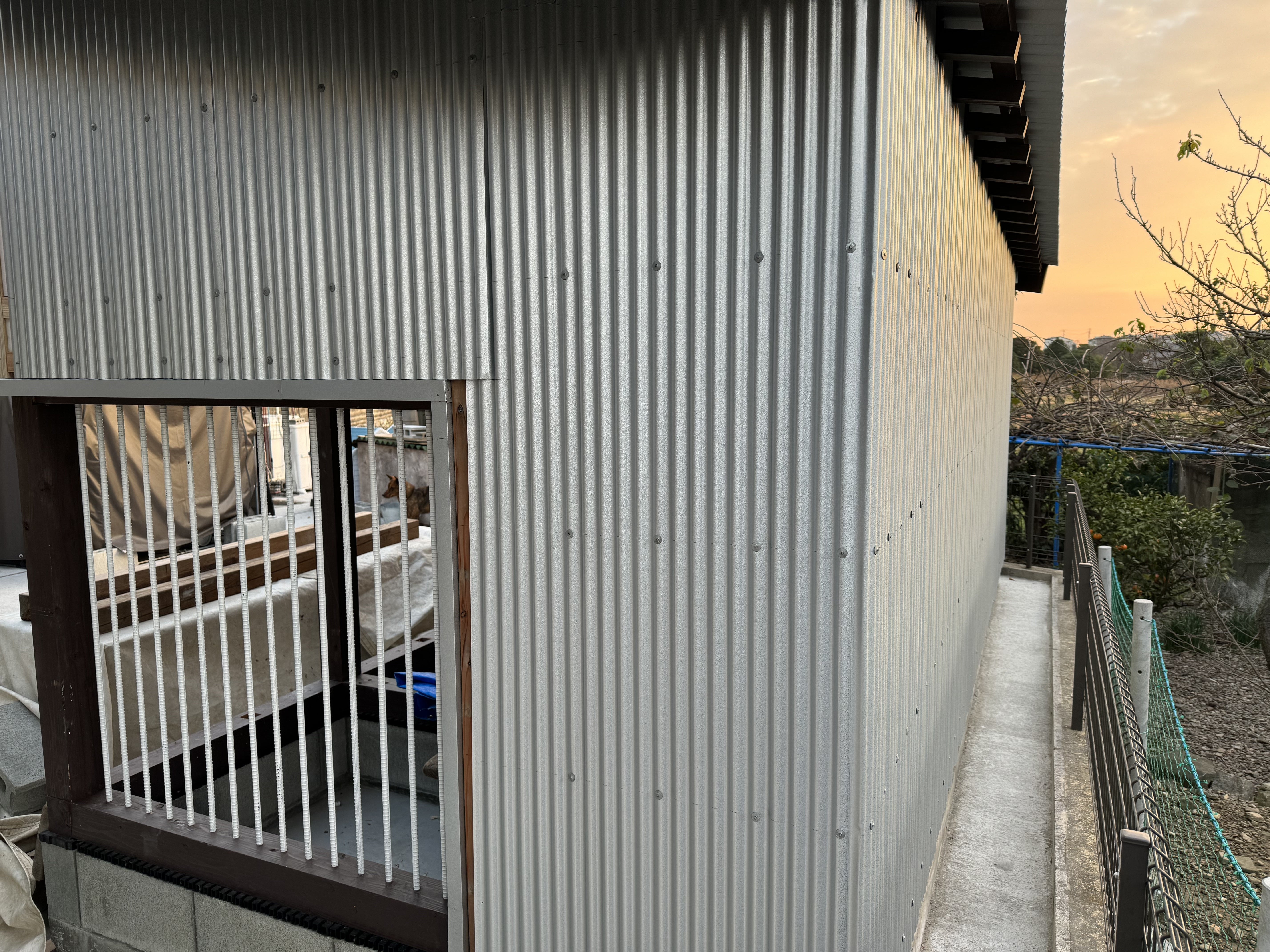 壁には断熱材、格子、ガルバニウム鋼板が一部張られました。