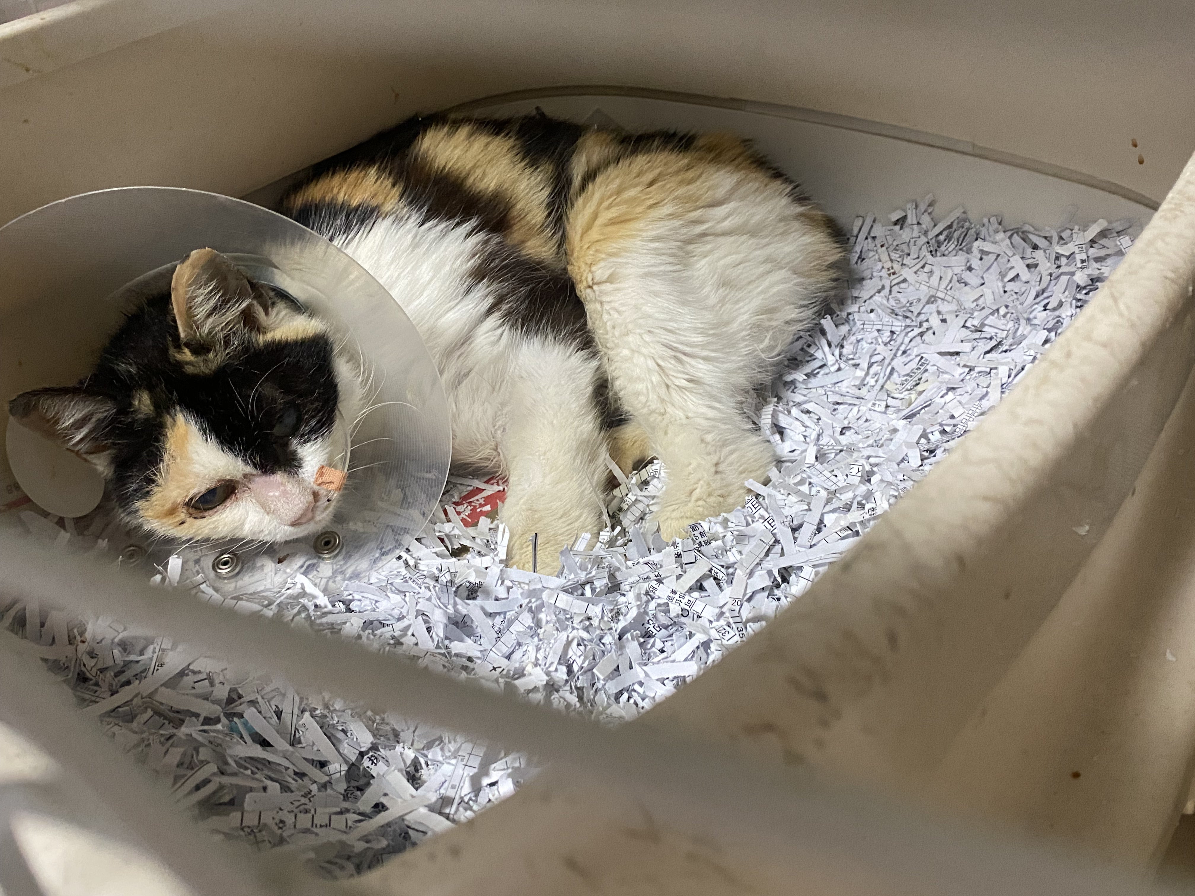 にこちゃんですが食欲増進剤を服用しても食欲の回復が見込めませんでした…。アメブロ:にこちゃん鼻チューブ付けました鼻チューブを付け食事がとれている感じです。カラーが邪魔で不機嫌そうでしたが少し慣れてきたのか、給餌の際背中をなでるとゴロゴロ言ってくれるようになりました。いつもシャーシャー怒るので嬉しかったです。にこちゃんの最近の楽しみはちゅーるです。あげすぎは良くないですが、あまり長くないと思うと今は好きなものを食べてほしいなと思ってます。一応総合栄養食タイプのちゅーるにしてます。昨日から、給餌の際に少しだけお部屋をお散歩する時間を作ってます。元飼い主さんにもにこちゃんの現状を昨日お伝えしました。手術をやめ、抗腫瘍剤での病気の進行を緩めるという形になったとお伝えしたら帰宅できるのですか?と言われました。帰宅とは、元飼い主さんのとこに戻れる、という意味だと私は思いましたのでにこちゃんはお外では生活ができないこと、鼻チューブをつけそれでご飯を食べお薬を飲ませること、定期的に病院へ通わないといけないことをお伝えしお返しできないと連絡しました。ご自身でそれらができるのなら、元飼い主さんにお返しすることも考えます。残りのニャン、生まれ育った環境で過ごせるならその方が良いです。ですが、病気に気づいていても、お金がかかるから、もう何もしないと、始めから医療にかけられていなかった方たちなのでお返ししても病院へは通ってもらえないかもしれないです…。返せと言われれば、所有権の放棄をしてもらわないと私の方で保護することはできません。今は、ただただ私にお世話になっていることが気がかりになられているようですが…そこにいる猫たちが幸せであれるように面倒見てあげてくださいとお返事しました。今度にこちゃんに会いに来てもらえるといいなと思います。