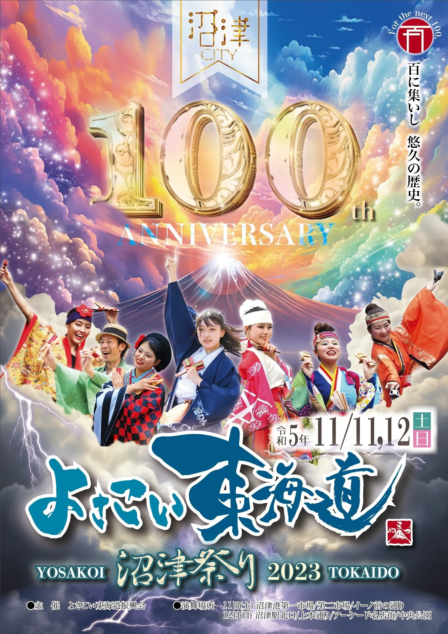 今年、沼津市は市制100周年を迎え、市内外の皆様と一緒に「よさこい東海道沼津祭り2023」を沼津市「100周年」のお祭りとしてお祝いムードで開催することを目指しています。