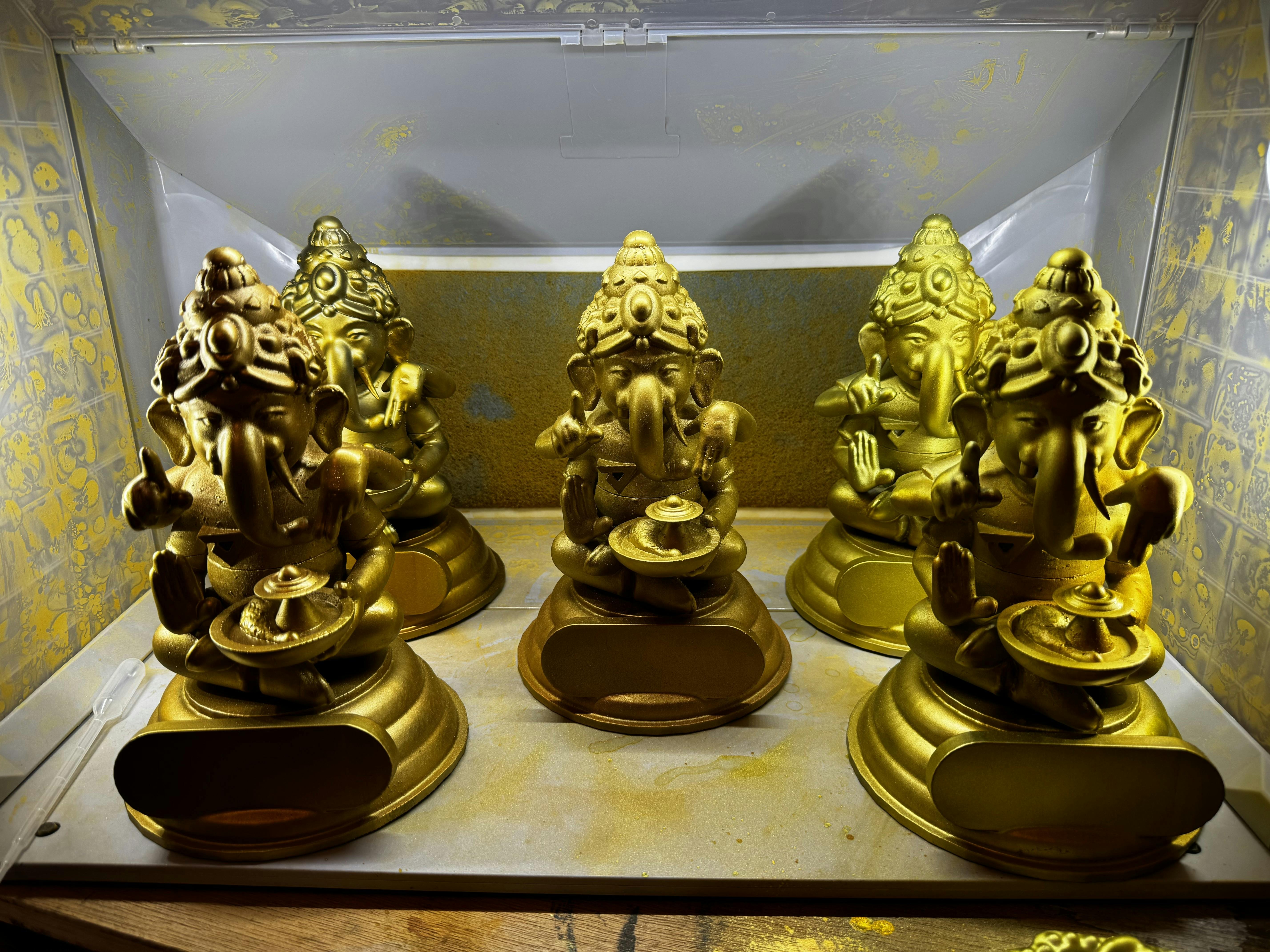 大変お待たせしているガネーシャ像の製作ですが(…ホントにすみません)もうすぐ完成です!エアブラシでゴールドに塗装完了、せっかくなので5体それぞれ微妙に違うタイプのゴールドに仕上げてみました。この写真は数日前のもので、実は今はもう御名前プレート(こちらも3Dプリントした金ピカ文字)もついてますー。あとは入魂の儀式(?)を残すのみ…もうしばしお待ちくださいませ!