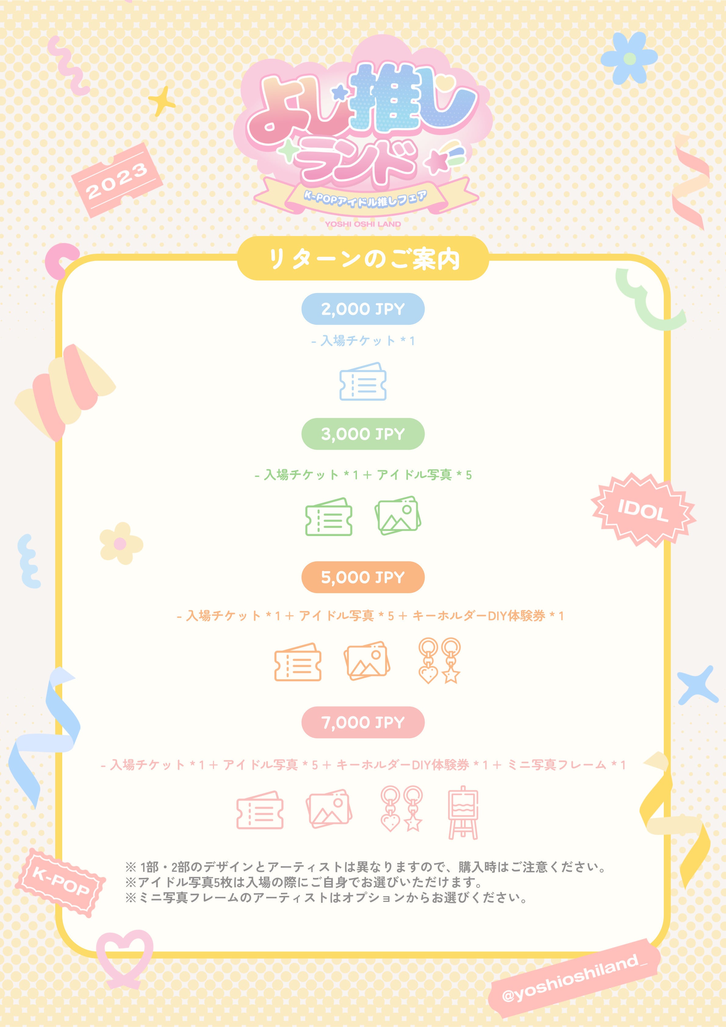 ※アイドル写真*5枚(会場で選択)、キーホルダーDIY体験券*1枚は会場でのお渡しになります。