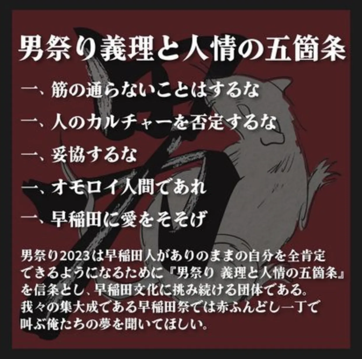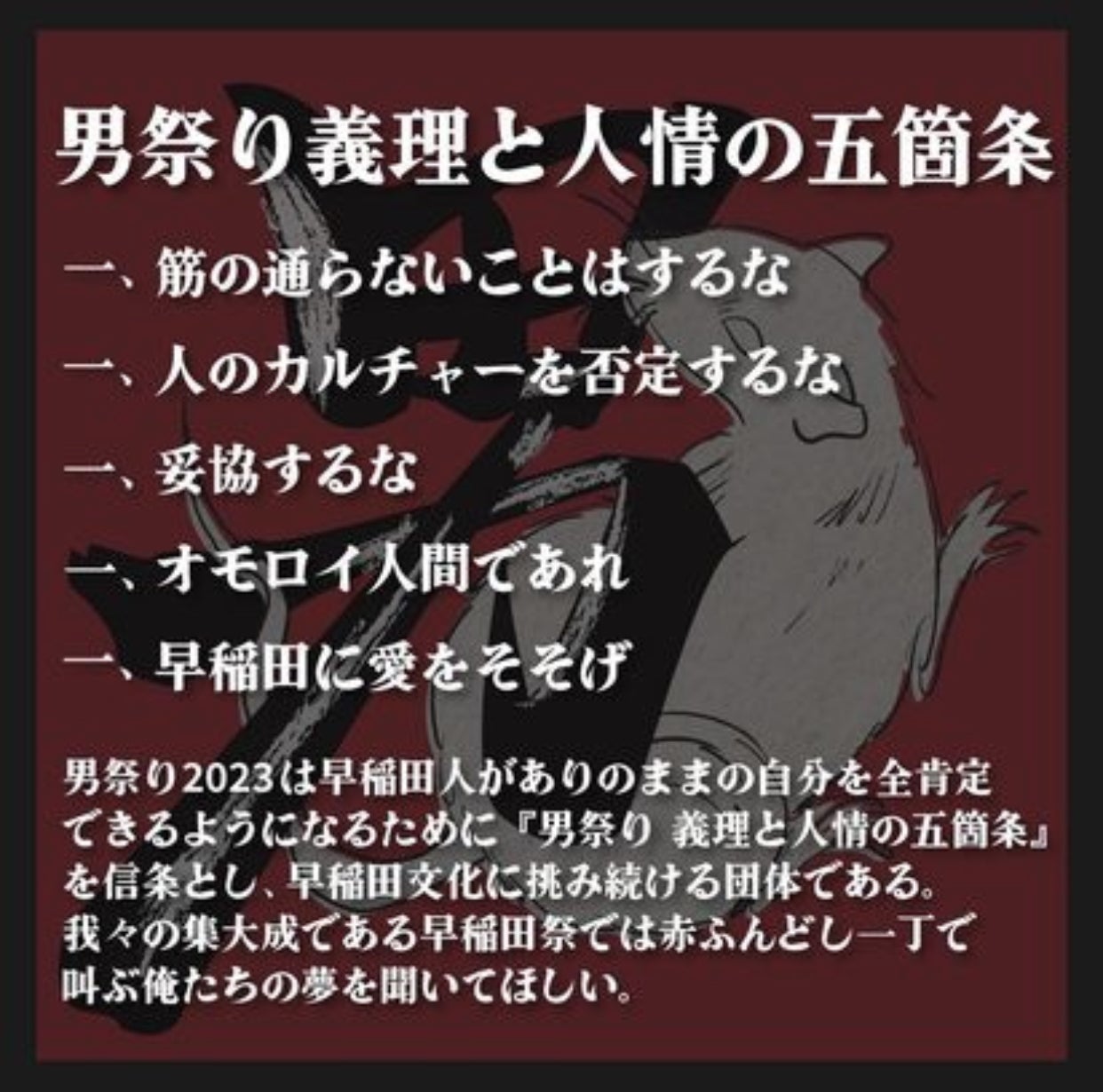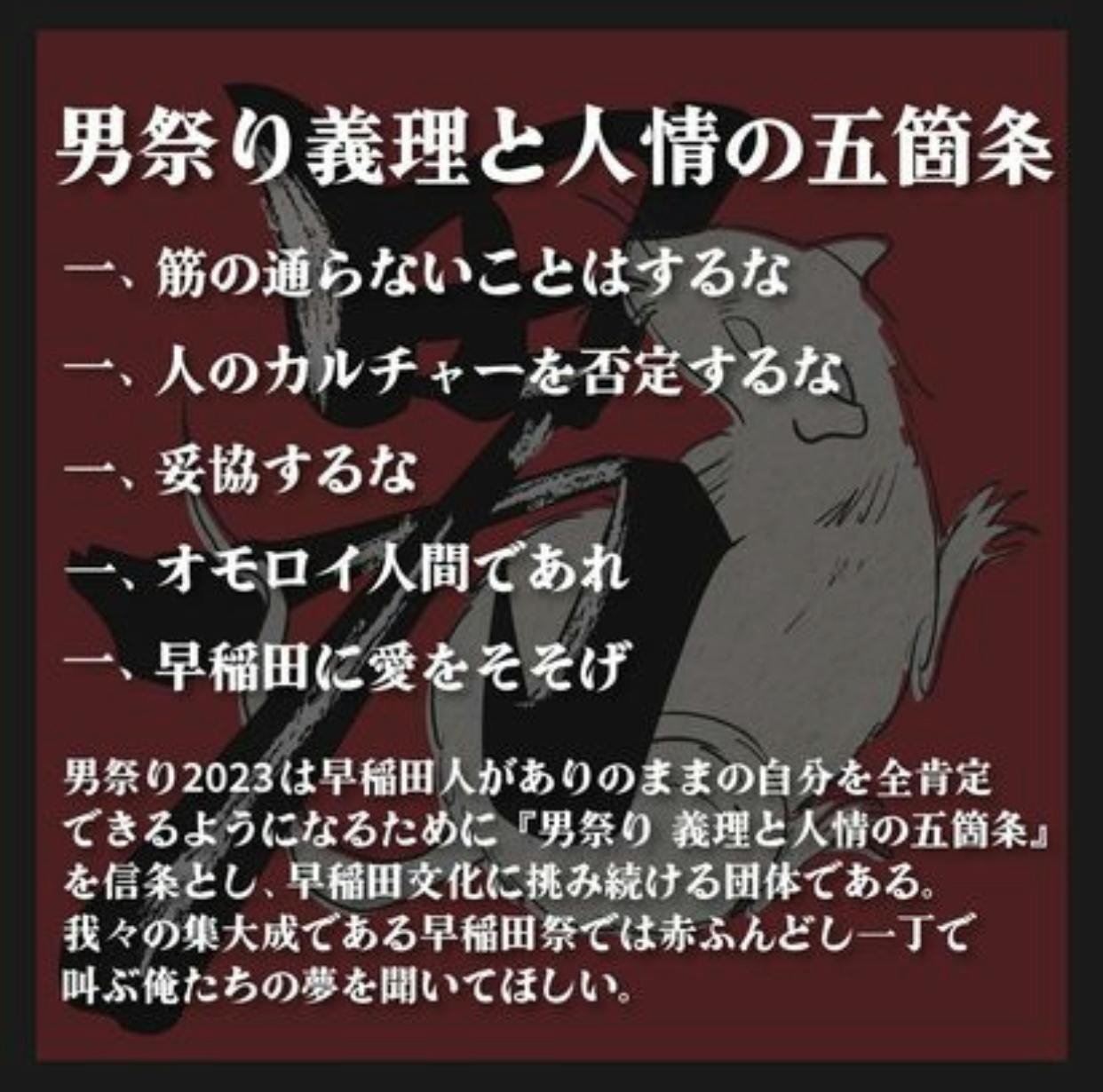 「夢見て魅せる」ことができるような人間であるべく、この五か条を頭の中に日々刻み込んで活動しています。自分達の発言・行動に筋を通し、好き嫌い関係なく全ての人のカルチャーをリスペクトしつつ、自分のカルチャーを愛する。また、自分の信念に妥協することなく意見をぶつけ合う。そして人を喜ばせられるような面白い人間で居続ける。大好きなこの早稲田で。そんな人間が人に何かを伝えられるのだと我々は信じています。